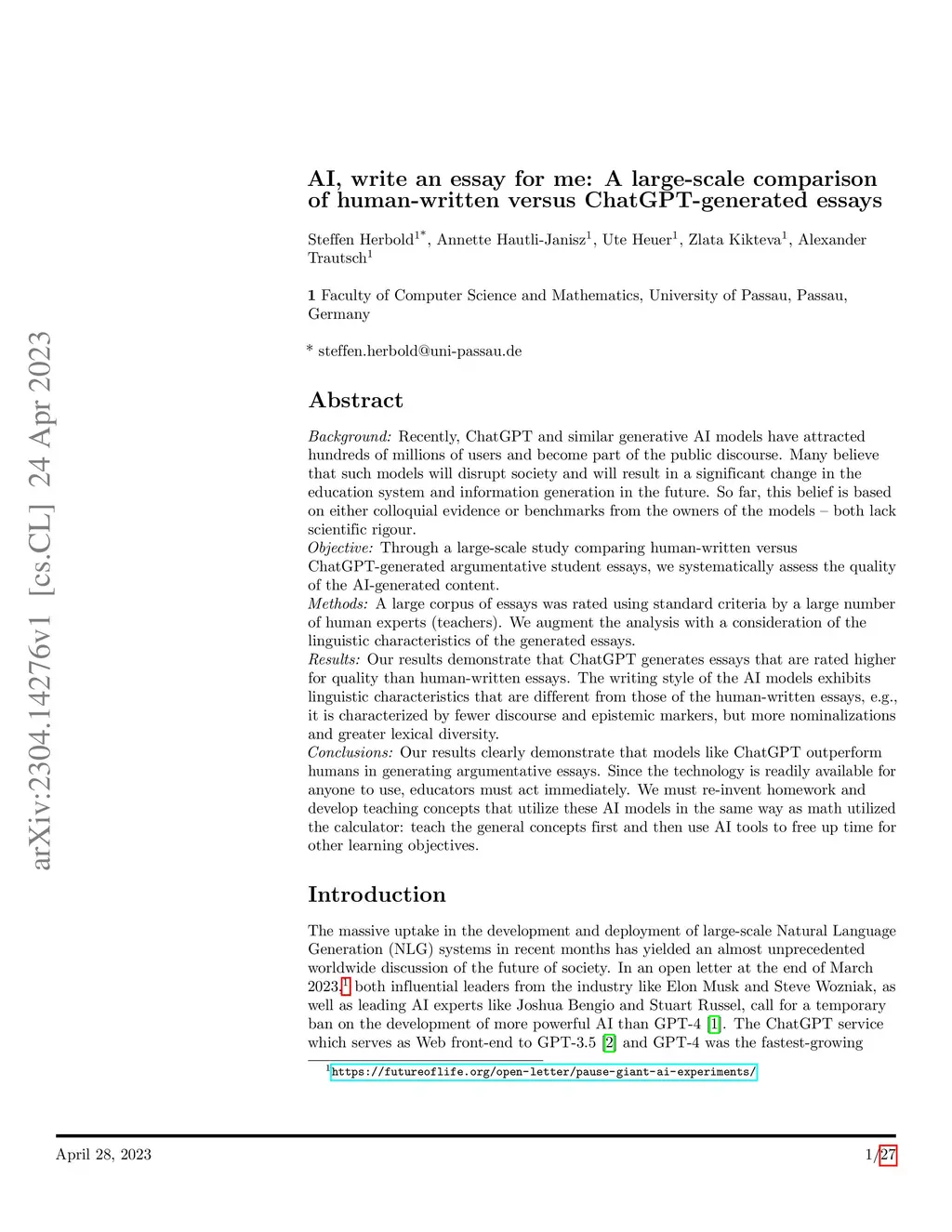 Background: Recently, ChatGPT and similar generative AI models have attracted hundreds of millions of users and become part of the public discourse. Many believe that such models will disrupt society and will result in a significant change in the education system and information generation in the future. So far, this belief is based on either colloquial evidence or benchmarks from the owners of the models -- both lack scientific rigour. Objective: Through a large-scale study comparing human-written versus ChatGPT-generated argumentative student essays, we systematically assess the quality of the AI-generated content. Methods: A large corpus of essays was rated using standard criteria by a large number of human experts (teachers). We augment the analysis with a consideration of the linguistic characteristics of the generated essays. Results: Our results demonstrate that ChatGPT generates essays that are rated higher for quality than human-written essays. The writing style of the AI models exhibits linguistic characteristics that are different from those of the human-written essays, e.g., it is characterized by fewer discourse and epistemic markers, but more nominalizations and greater lexical diversity. Conclusions: Our results clearly demonstrate that models like ChatGPT outperform humans in generating argumentative essays. Since the technology is readily available for anyone to use, educators must act immediately. We must re-invent homework and develop teaching concepts that utilize these AI models in the same way as math utilized the calculator: teach the general concepts first and then use AI tools to free up time for other learning objectives.