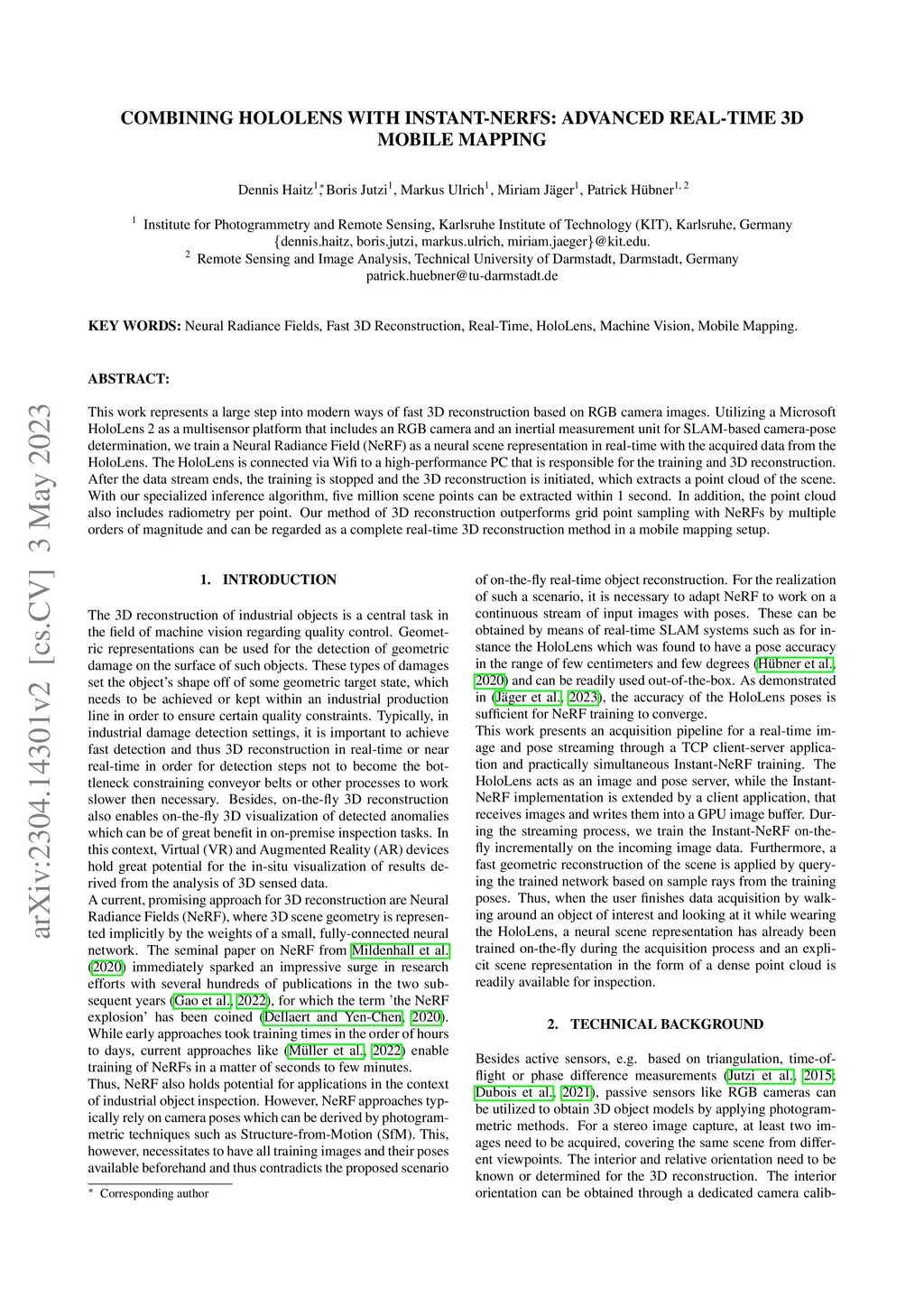 This work represents a large step into modern ways of fast 3D reconstruction based on RGB camera images. Utilizing a Microsoft HoloLens 2 as a multisensor platform that includes an RGB camera and an inertial measurement unit for SLAM-based camera-pose determination, we train a Neural Radiance Field (NeRF) as a neural scene representation in real-time with the acquired data from the HoloLens. The HoloLens is connected via Wifi to a high-performance PC that is responsible for the training and 3D reconstruction. After the data stream ends, the training is stopped and the 3D reconstruction is initiated, which extracts a point cloud of the scene. With our specialized inference algorithm, five million scene points can be extracted within 1 second. In addition, the point cloud also includes radiometry per point. Our method of 3D reconstruction outperforms grid point sampling with NeRFs by multiple orders of magnitude and can be regarded as a complete real-time 3D reconstruction method in a mobile mapping setup.