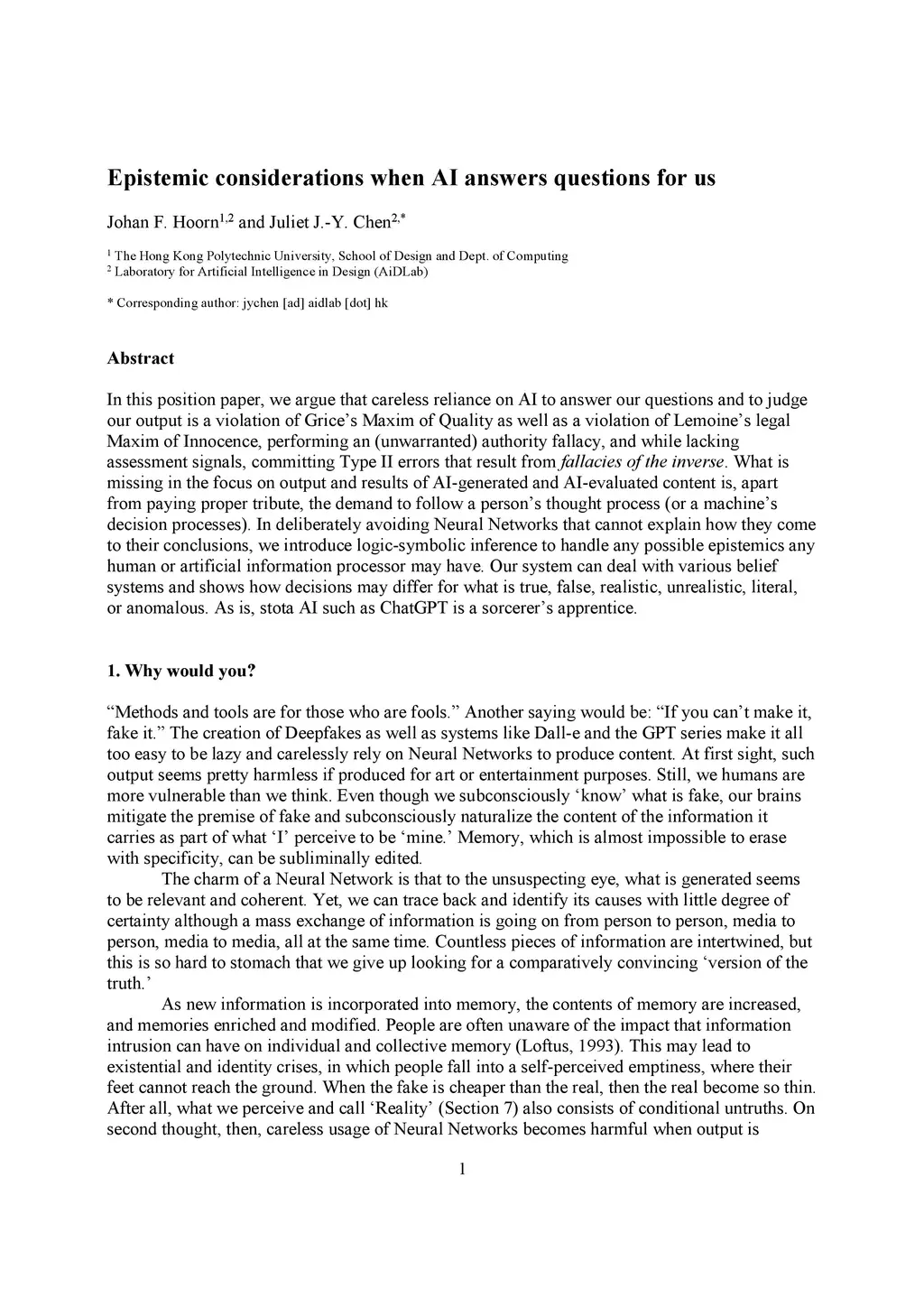 In this position paper, we argue that careless reliance on AI to answer our questions and to judge our output is a violation of Grice's Maxim of Quality as well as a violation of Lemoine's legal Maxim of Innocence, performing an (unwarranted) authority fallacy, and while lacking assessment signals, committing Type II errors that result from fallacies of the inverse. What is missing in the focus on output and results of AI-generated and AI-evaluated content is, apart from paying proper tribute, the demand to follow a person's thought process (or a machine's decision processes). In deliberately avoiding Neural Networks that cannot explain how they come to their conclusions, we introduce logic-symbolic inference to handle any possible epistemics any human or artificial information processor may have. Our system can deal with various belief systems and shows how decisions may differ for what is true, false, realistic, unrealistic, literal, or anomalous. As is, stota AI such as ChatGPT is a sorcerer's apprentice.