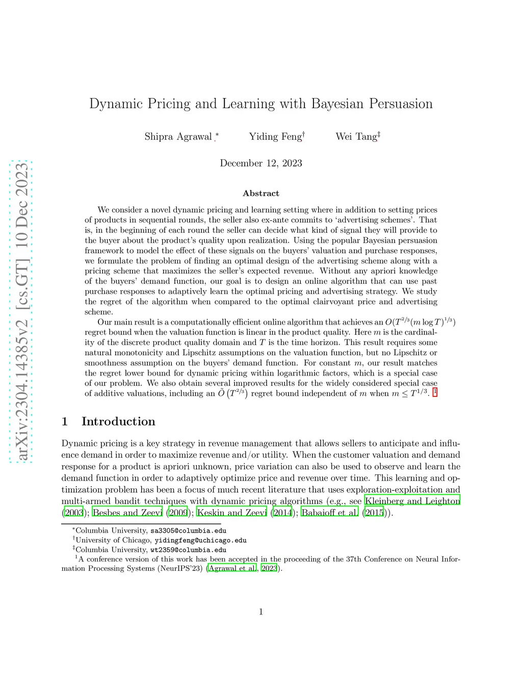 We consider a novel dynamic pricing and learning setting where in addition to setting prices of products in sequential rounds, the seller also ex-ante commits to ádvertising schemes'. That is, in the beginning of each round the seller can decide what kind of signal they will provide to the buyer about the product's quality upon realization. Using the popular Bayesian persuasion framework to model the effect of these signals on the buyers' valuation and purchase responses, we formulate the problem of finding an optimal design of the advertising scheme along with a pricing scheme that maximizes the seller's expected revenue. Without any apriori knowledge of the buyers' demand function, our goal is to design an online algorithm that can use past purchase responses to adaptively learn the optimal pricing and advertising strategy. We study the regret of the algorithm when compared to the optimal clairvoyant price and advertising scheme. Our main result is a computationally efficient online algorithm that achieves an regret bound when the valuation function is linear in the product quality. Here is the cardinality of the discrete product quality domain and is the time horizon. This result requires some natural monotonicity and Lipschitz assumptions on the valuation function, but no Lipschitz or smoothness assumption on the buyers' demand function. For constant , our result matches the regret lower bound for dynamic pricing within logarithmic factors, which is a special case of our problem. We also obtain several improved results for the widely considered special case of additive valuations, including an regret bound independent of when .