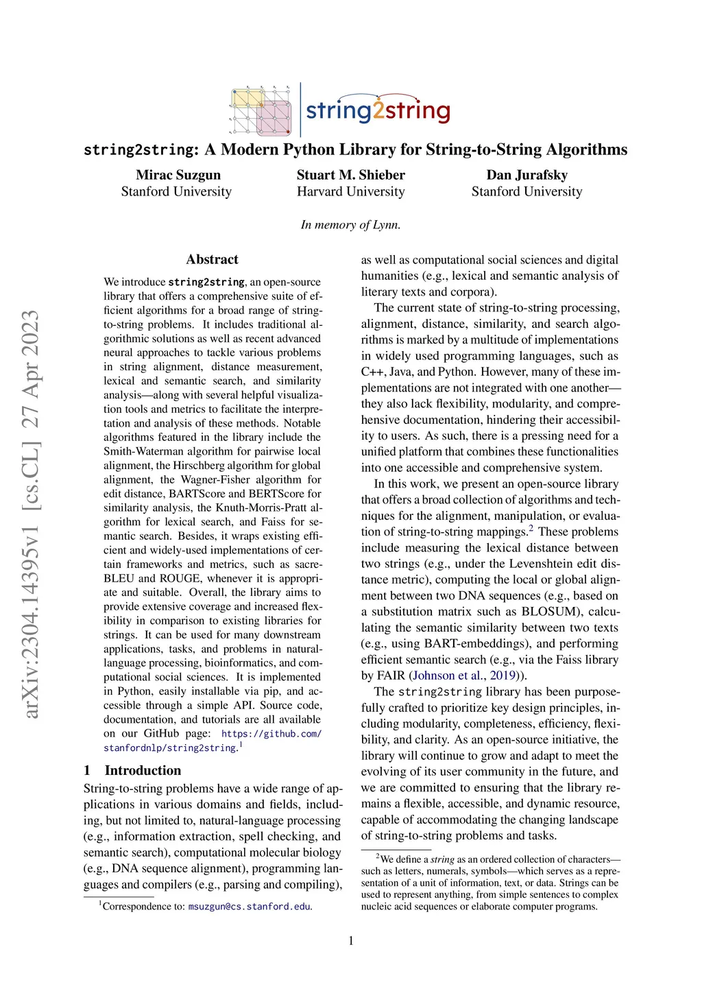 We introduce string2string, an open-source library that offers a comprehensive suite of efficient algorithms for a broad range of string-to-string problems. It includes traditional algorithmic solutions as well as recent advanced neural approaches to tackle various problems in string alignment, distance measurement, lexical and semantic search, and similarity analysis -- along with several helpful visualization tools and metrics to facilitate the interpretation and analysis of these methods. Notable algorithms featured in the library include the Smith-Waterman algorithm for pairwise local alignment, the Hirschberg algorithm for global alignment, the Wagner-Fisher algorithm for edit distance, BARTScore and BERTScore for similarity analysis, the Knuth-Morris-Pratt algorithm for lexical search, and Faiss for semantic search. Besides, it wraps existing efficient and widely-used implementations of certain frameworks and metrics, such as sacreBLEU and ROUGE, whenever it is appropriate and suitable. Overall, the library aims to provide extensive coverage and increased flexibility in comparison to existing libraries for strings. It can be used for many downstream applications, tasks, and problems in natural-language processing, bioinformatics, and computational social sciences. It is implemented in Python, easily installable via pip, and accessible through a simple API. Source code, documentation, and tutorials are all available on our GitHub page: https://github.com/stanfordnlp/string2string.
