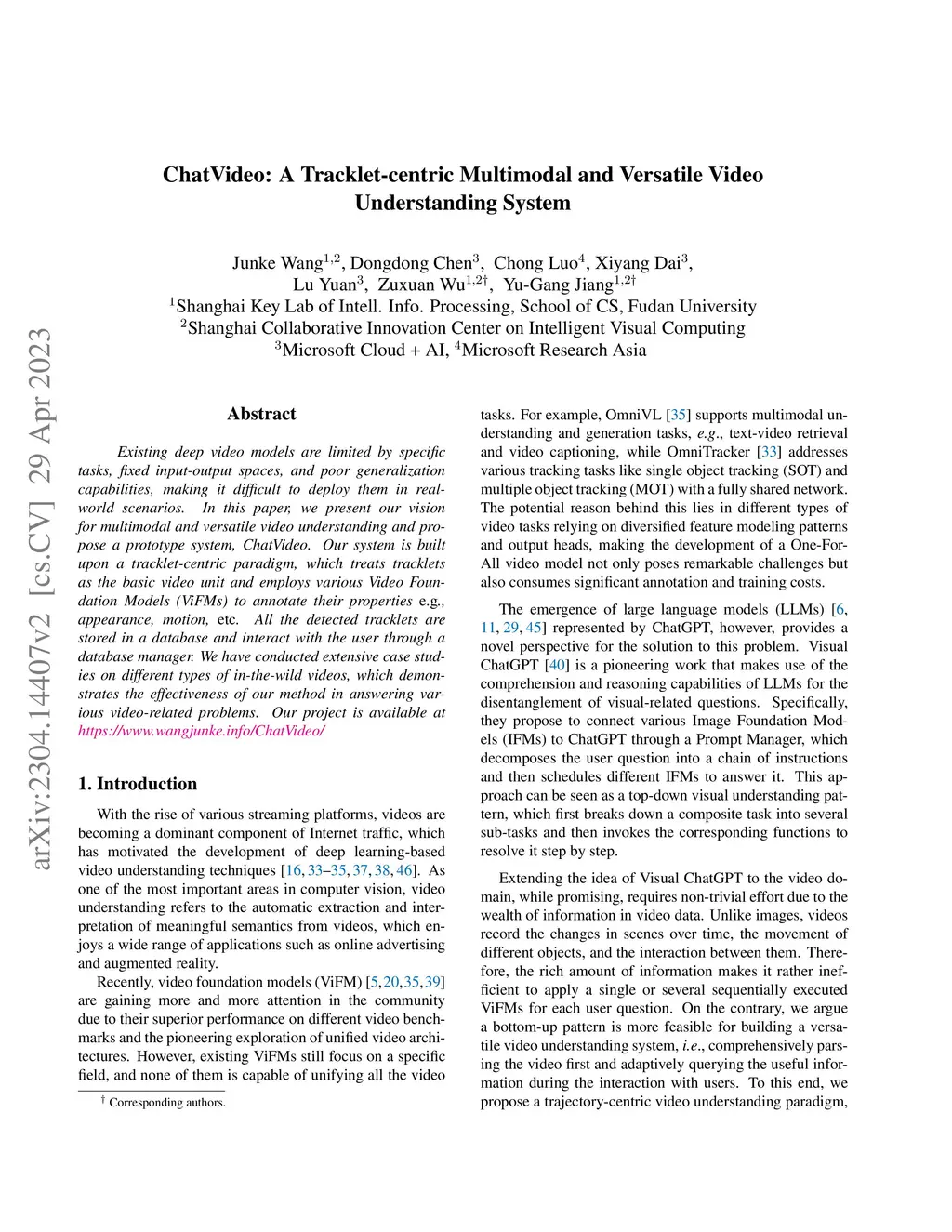 Existing deep video models are limited by specific tasks, fixed input-output spaces, and poor generalization capabilities, making it difficult to deploy them in real-world scenarios. In this paper, we present our vision for multimodal and versatile video understanding and propose a prototype system, \system. Our system is built upon a tracklet-centric paradigm, which treats tracklets as the basic video unit and employs various Video Foundation Models (ViFMs) to annotate their properties e.g., appearance, motion, \etc. All the detected tracklets are stored in a database and interact with the user through a database manager. We have conducted extensive case studies on different types of in-the-wild videos, which demonstrates the effectiveness of our method in answering various video-related problems. Our project is available at https://www.wangjunke.info/ChatVideo/