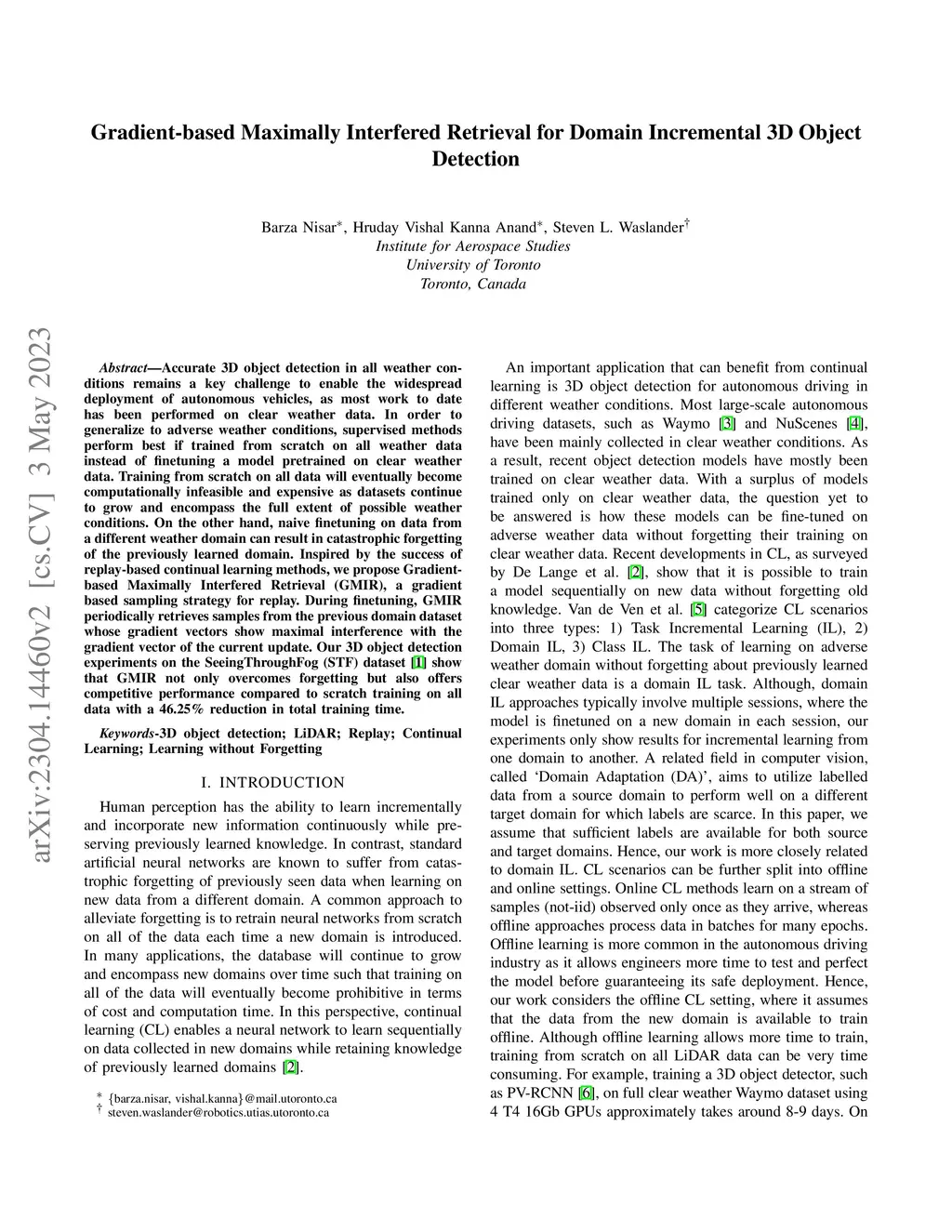 Accurate 3D object detection in all weather conditions remains a key challenge to enable the widespread deployment of autonomous vehicles, as most work to date has been performed on clear weather data. In order to generalize to adverse weather conditions, supervised methods perform best if trained from scratch on all weather data instead of finetuning a model pretrained on clear weather data. Training from scratch on all data will eventually become computationally infeasible and expensive as datasets continue to grow and encompass the full extent of possible weather conditions. On the other hand, naive finetuning on data from a different weather domain can result in catastrophic forgetting of the previously learned domain. Inspired by the success of replay-based continual learning methods, we propose Gradient-based Maximally Interfered Retrieval (GMIR), a gradient based sampling strategy for replay. During finetuning, GMIR periodically retrieves samples from the previous domain dataset whose gradient vectors show maximal interference with the gradient vector of the current update. Our 3D object detection experiments on the SeeingThroughFog (STF) dataset show that GMIR not only overcomes forgetting but also offers competitive performance compared to scratch training on all data with a 46.25% reduction in total training time.