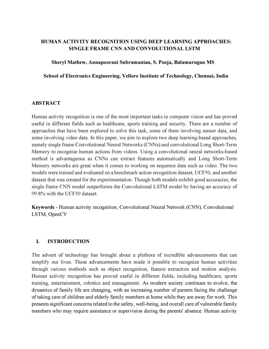 Human activity recognition is one of the most important tasks in computer vision and has proved useful in different fields such as healthcare, sports training and security. There are a number of approaches that have been explored to solve this task, some of them involving sensor data, and some involving video data. In this paper, we aim to explore two deep learning-based approaches, namely single frame Convolutional Neural Networks (CNNs) and convolutional Long Short-Term Memory to recognise human actions from videos. Using a convolutional neural networks-based method is advantageous as CNNs can extract features automatically and Long Short-Term Memory networks are great when it comes to working on sequence data such as video. The two models were trained and evaluated on a benchmark action recognition dataset, UCF50, and another dataset that was created for the experimentation. Though both models exhibit good accuracies, the single frame CNN model outperforms the Convolutional LSTM model by having an accuracy of 99.8% with the UCF50 dataset.