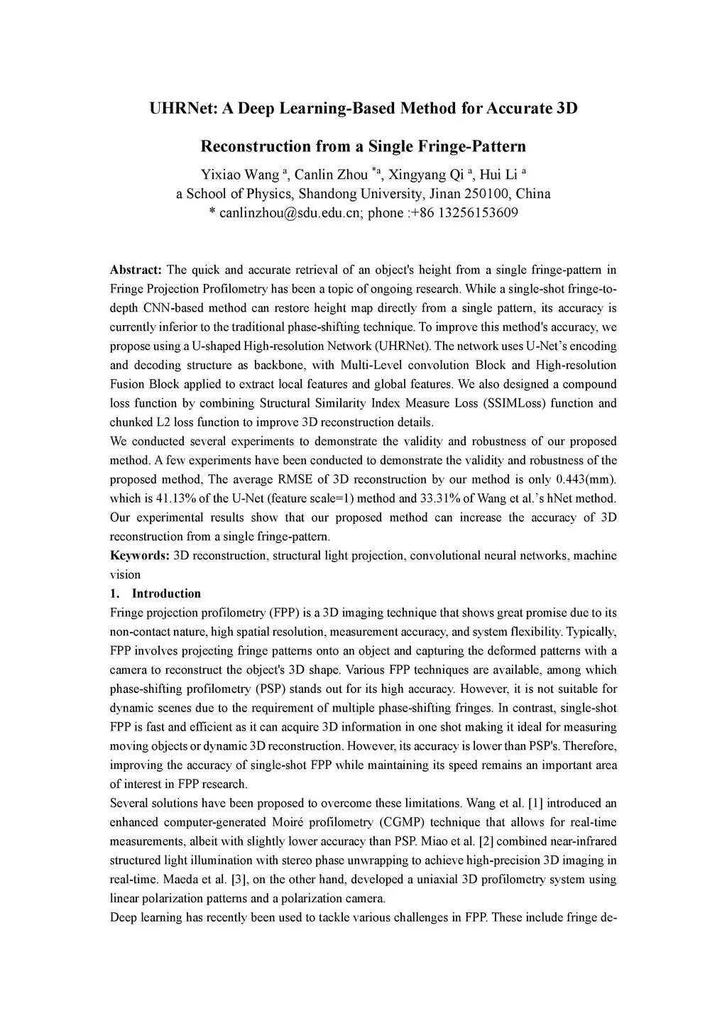 UHRNet: A Deep Learning-Based Method for Accurate 3D Reconstruction from