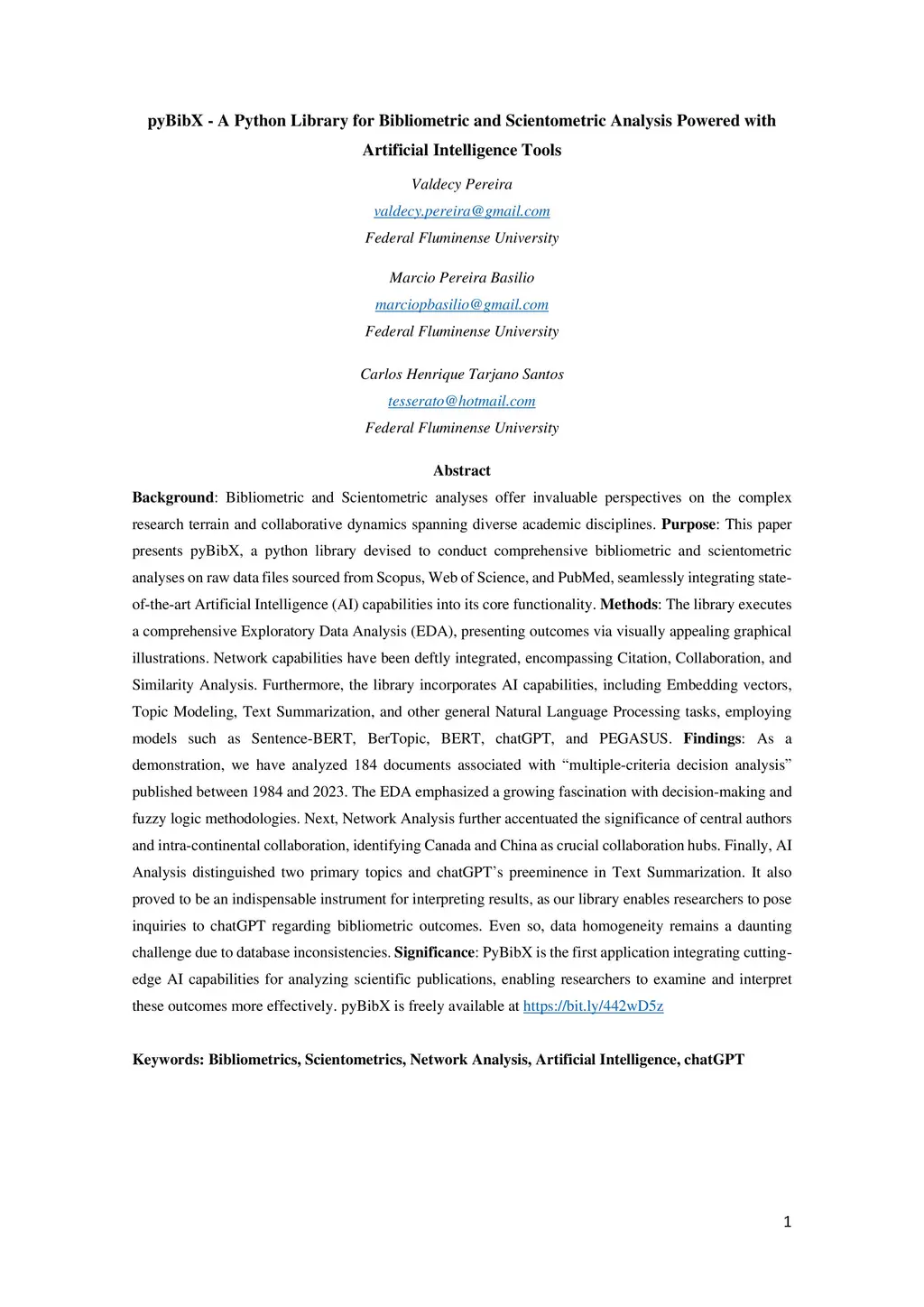 Bibliometric and Scientometric analyses offer invaluable perspectives on the complex research terrain and collaborative dynamics spanning diverse academic disciplines. This paper presents pyBibX, a python library devised to conduct comprehensive bibliometric and scientometric analyses on raw data files sourced from Scopus, Web of Science, and PubMed, seamlessly integrating state of the art AI capabilities into its core functionality. The library executes a comprehensive EDA, presenting outcomes via visually appealing graphical illustrations. Network capabilities have been deftly integrated, encompassing Citation, Collaboration, and Similarity Analysis. Furthermore, the library incorporates AI capabilities, including Embedding vectors, Topic Modeling, Text Summarization, and other general Natural Language Processing tasks, employing models such as Sentence-BERT, BerTopic, BERT, chatGPT, and PEGASUS. As a demonstration, we have analyzed 184 documents associated with multiple-criteria decision analysis published between 1984 and 2023. The EDA emphasized a growing fascination with decision-making and fuzzy logic methodologies. Next, Network Analysis further accentuated the significance of central authors and intra-continental collaboration, identifying Canada and China as crucial collaboration hubs. Finally, AI Analysis distinguished two primary topics and chatGPT preeminence in Text Summarization. It also proved to be an indispensable instrument for interpreting results, as our library enables researchers to pose inquiries to chatGPT regarding bibliometric outcomes. Even so, data homogeneity remains a daunting challenge due to database inconsistencies. PyBibX is the first application integrating cutting-edge AI capabilities for analyzing scientific publications, enabling researchers to examine and interpret these outcomes more effectively.