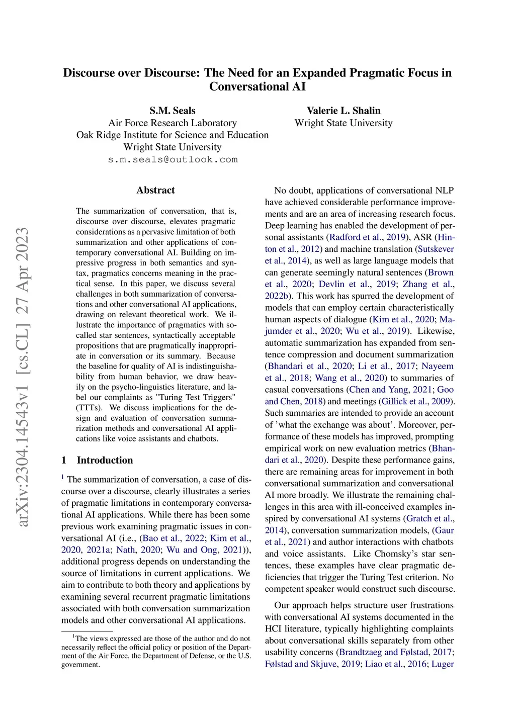The summarization of conversation, that is, discourse over discourse, elevates pragmatic considerations as a pervasive limitation of both summarization and other applications of contemporary conversational AI. Building on impressive progress in both semantics and syntax, pragmatics concerns meaning in the practical sense. In this paper, we discuss several challenges in both summarization of conversations and other conversational AI applications, drawing on relevant theoretical work. We illustrate the importance of pragmatics with so-called star sentences, syntactically acceptable propositions that are pragmatically inappropriate in conversation or its summary. Because the baseline for quality of AI is indistinguishability from human behavior, we draw heavily on the psycho-linguistics literature, and label our complaints as "Turing Test Triggers" (TTTs). We discuss implications for the design and evaluation of conversation summarization methods and conversational AI applications like voice assistants and chatbots