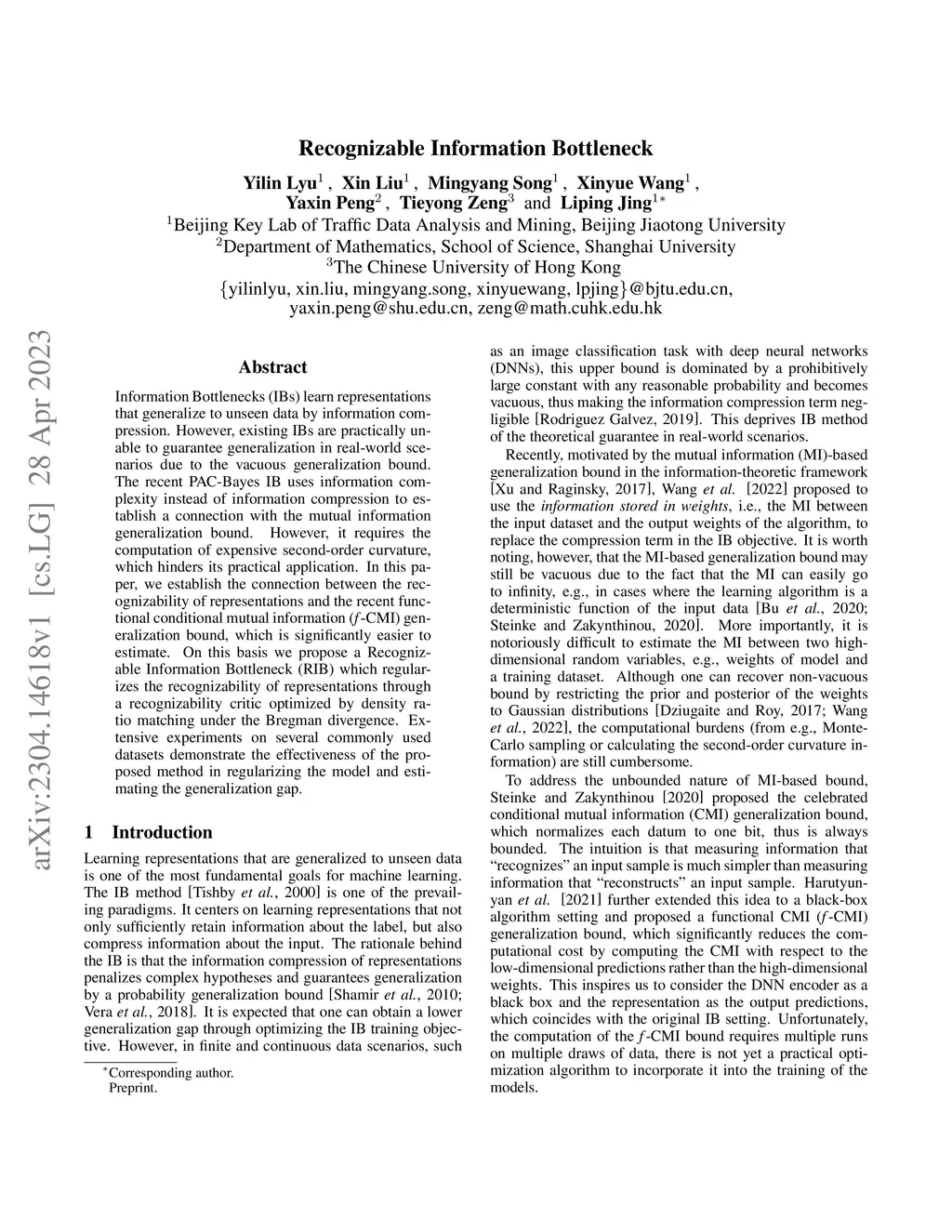 Information Bottlenecks (IBs) learn representations that generalize to unseen data by information compression. However, existing IBs are practically unable to guarantee generalization in real-world scenarios due to the vacuous generalization bound. The recent PAC-Bayes IB uses information complexity instead of information compression to establish a connection with the mutual information generalization bound. However, it requires the computation of expensive second-order curvature, which hinders its practical application. In this paper, we establish the connection between the recognizability of representations and the recent functional conditional mutual information (f-CMI) generalization bound, which is significantly easier to estimate. On this basis we propose a Recognizable Information Bottleneck (RIB) which regularizes the recognizability of representations through a recognizability critic optimized by density ratio matching under the Bregman divergence. Extensive experiments on several commonly used datasets demonstrate the effectiveness of the proposed method in regularizing the model and estimating the generalization gap.