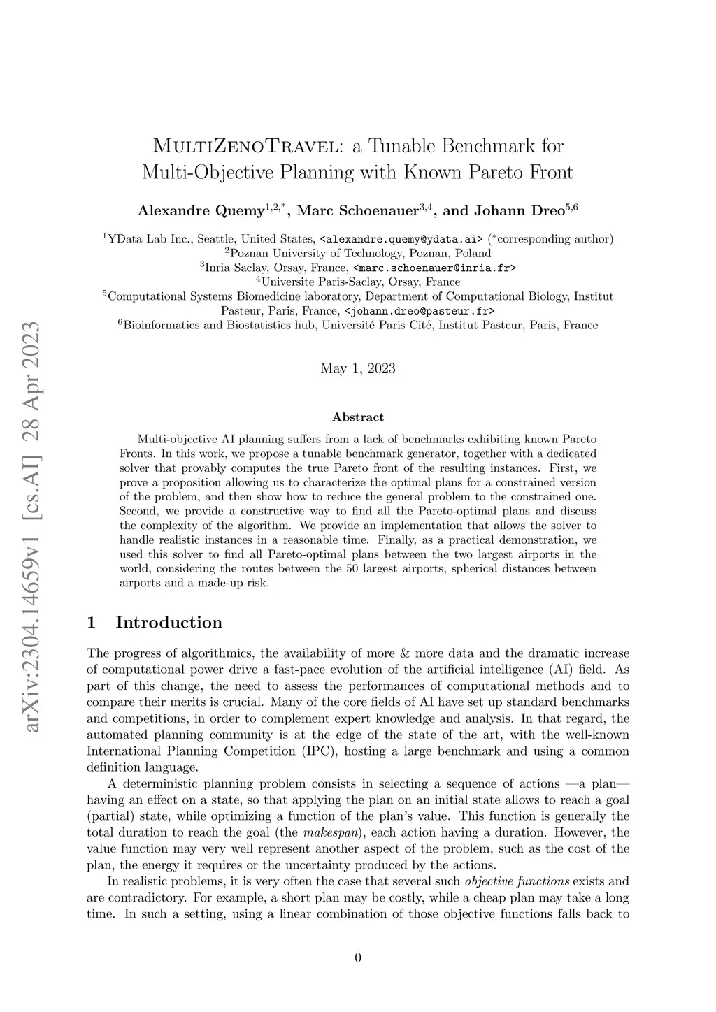 Multi-objective AI planning suffers from a lack of benchmarks exhibiting known Pareto Fronts. In this work, we propose a tunable benchmark generator, together with a dedicated solver that provably computes the true Pareto front of the resulting instances. First, we prove a proposition allowing us to characterize the optimal plans for a constrained version of the problem, and then show how to reduce the general problem to the constrained one. Second, we provide a constructive way to find all the Pareto-optimal plans and discuss the complexity of the algorithm. We provide an implementation that allows the solver to handle realistic instances in a reasonable time. Finally, as a practical demonstration, we used this solver to find all Pareto-optimal plans between the two largest airports in the world, considering the routes between the 50 largest airports, spherical distances between airports and a made-up risk.