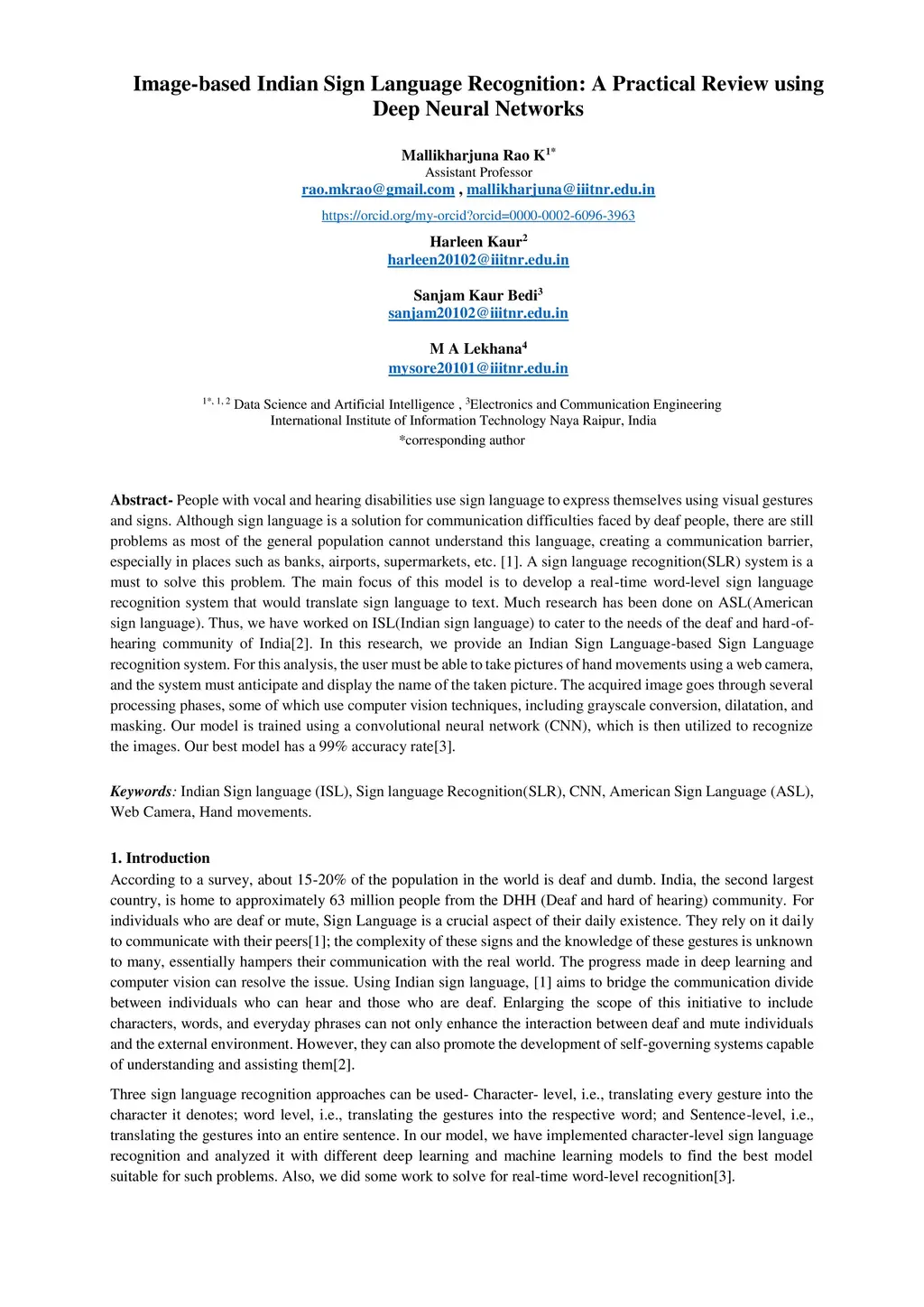 People with vocal and hearing disabilities use sign language to express themselves using visual gestures and signs. Although sign language is a solution for communication difficulties faced by deaf people, there are still problems as most of the general population cannot understand this language, creating a communication barrier, especially in places such as banks, airports, supermarkets, etc. [1]. A sign language recognition(SLR) system is a must to solve this problem. The main focus of this model is to develop a real-time word-level sign language recognition system that would translate sign language to text. Much research has been done on ASL(American sign language). Thus, we have worked on ISL(Indian sign language) to cater to the needs of the deaf and hard-of-hearing community of India[2]. In this research, we provide an Indian Sign Language-based Sign Language recognition system. For this analysis, the user must be able to take pictures of hand movements using a web camera, and the system must anticipate and display the name of the taken picture. The acquired image goes through several processing phases, some of which use computer vision techniques, including grayscale conversion, dilatation, and masking. Our model is trained using a convolutional neural network (CNN), which is then utilized to recognize the images. Our best model has a 99% accuracy rate[3].