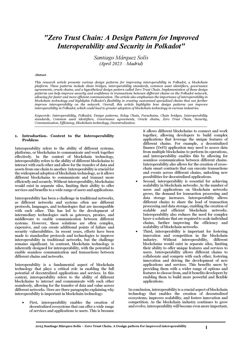 This research article presents various design patterns for improving interoperability in Polkadot, a blockchain platform. These patterns include chain bridges, interoperability standards, common asset identifiers, governance agreements, oracle chains, and a hypothetical design pattern called Zero Trust Chain. Implementation of these design patterns can help improve security and confidence in transactions between different chains on the Polkadot network, allowing for faster and more efficient communication. The article also emphasizes the importance of interoperability in blockchain technology and highlights Polkadot's flexibility in creating customized specialized chains that can further improve interoperability on the network. Overall, this article highlights how design patterns can improve interoperability in Polkadot, which could lead to greater adoption of blockchain technology in various industries.