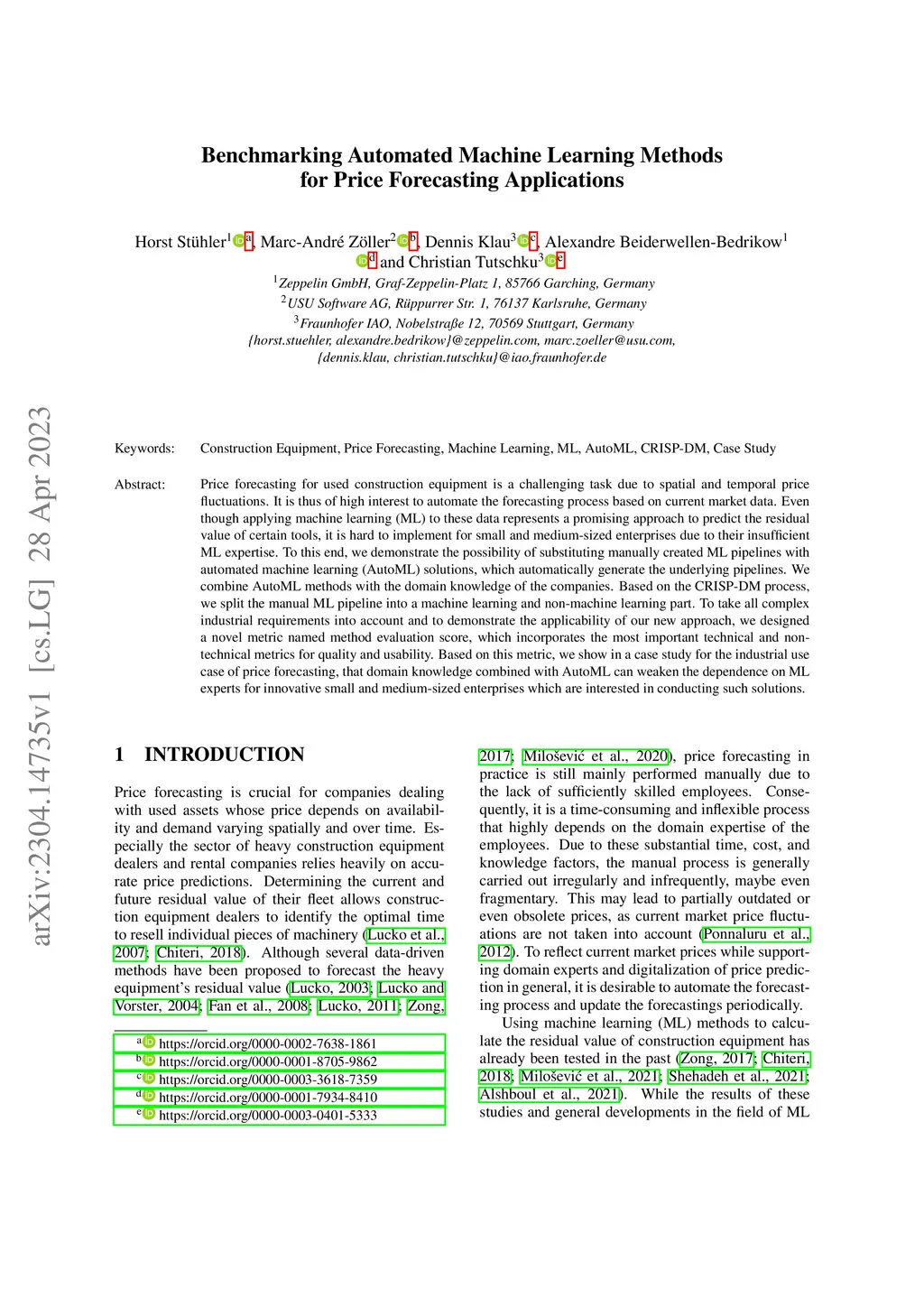 Price forecasting for used construction equipment is a challenging task due to spatial and temporal price fluctuations. It is thus of high interest to automate the forecasting process based on current market data. Even though applying machine learning (ML) to these data represents a promising approach to predict the residual value of certain tools, it is hard to implement for small and medium-sized enterprises due to their insufficient ML expertise. To this end, we demonstrate the possibility of substituting manually created ML pipelines with automated machine learning (AutoML) solutions, which automatically generate the underlying pipelines. We combine AutoML methods with the domain knowledge of the companies. Based on the CRISP-DM process, we split the manual ML pipeline into a machine learning and non-machine learning part. To take all complex industrial requirements into account and to demonstrate the applicability of our new approach, we designed a novel metric named method evaluation score, which incorporates the most important technical and non-technical metrics for quality and usability. Based on this metric, we show in a case study for the industrial use case of price forecasting, that domain knowledge combined with AutoML can weaken the dependence on ML experts for innovative small and medium-sized enterprises which are interested in conducting such solutions.