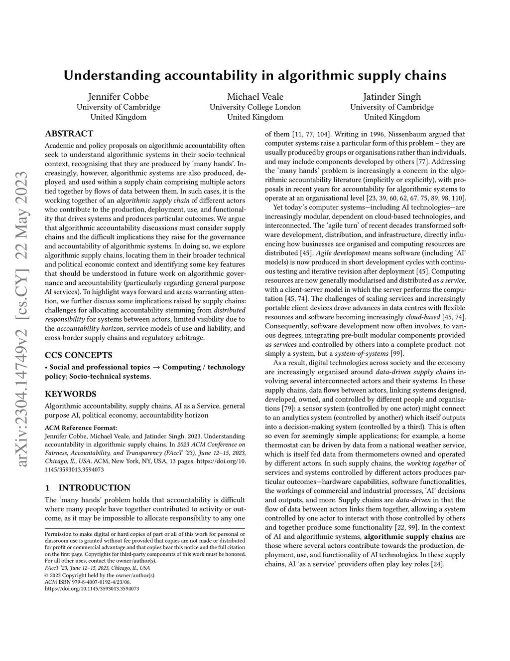 Academic and policy proposals on algorithmic accountability often seek to understand algorithmic systems in their socio-technical context, recognising that they are produced by 'many hands'. Increasingly, however, algorithmic systems are also produced, deployed, and used within a supply chain comprising multiple actors tied together by flows of data between them. In such cases, it is the working together of an algorithmic supply chain of different actors who contribute to the production, deployment, use, and functionality that drives systems and produces particular outcomes. We argue that algorithmic accountability discussions must consider supply chains and the difficult implications they raise for the governance and accountability of algorithmic systems. In doing so, we explore algorithmic supply chains, locating them in their broader technical and political economic context and identifying some key features that should be understood in future work on algorithmic governance and accountability (particularly regarding general purpose AI services). To highlight ways forward and areas warranting attention, we further discuss some implications raised by supply chains: challenges for allocating accountability stemming from distributed responsibility for systems between actors, limited visibility due to the accountability horizon, service models of use and liability, and cross-border supply chains and regulatory arbitrage