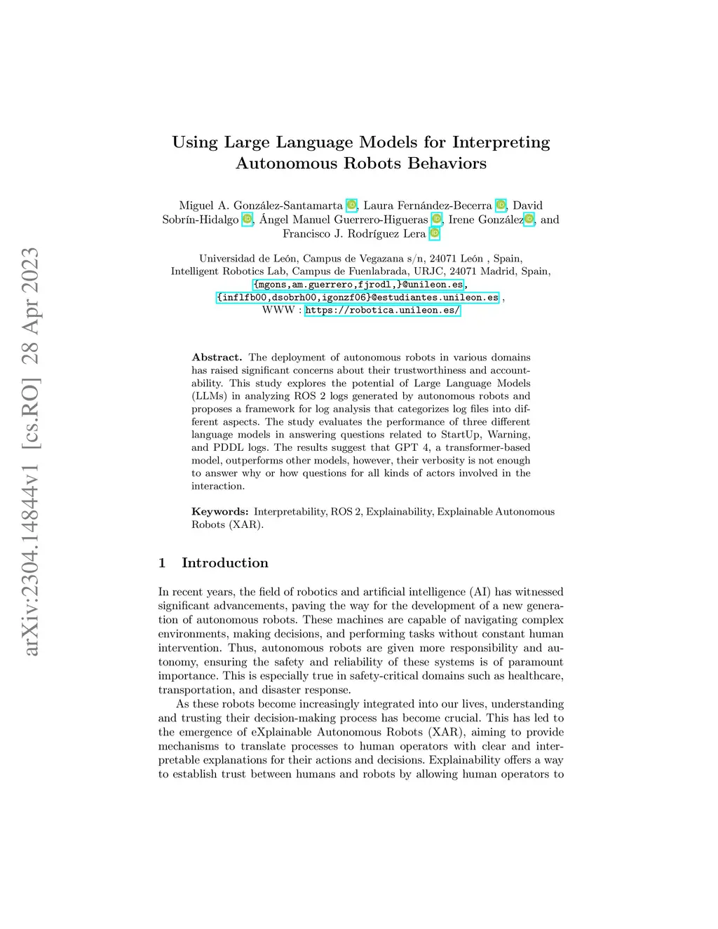 The deployment of autonomous robots in various domains has raised significant concerns about their trustworthiness and accountability. This study explores the potential of Large Language Models (LLMs) in analyzing ROS 2 logs generated by autonomous robots and proposes a framework for log analysis that categorizes log files into different aspects. The study evaluates the performance of three different language models in answering questions related to StartUp, Warning, and PDDL logs. The results suggest that GPT 4, a transformer-based model, outperforms other models, however, their verbosity is not enough to answer why or how questions for all kinds of actors involved in the interaction.