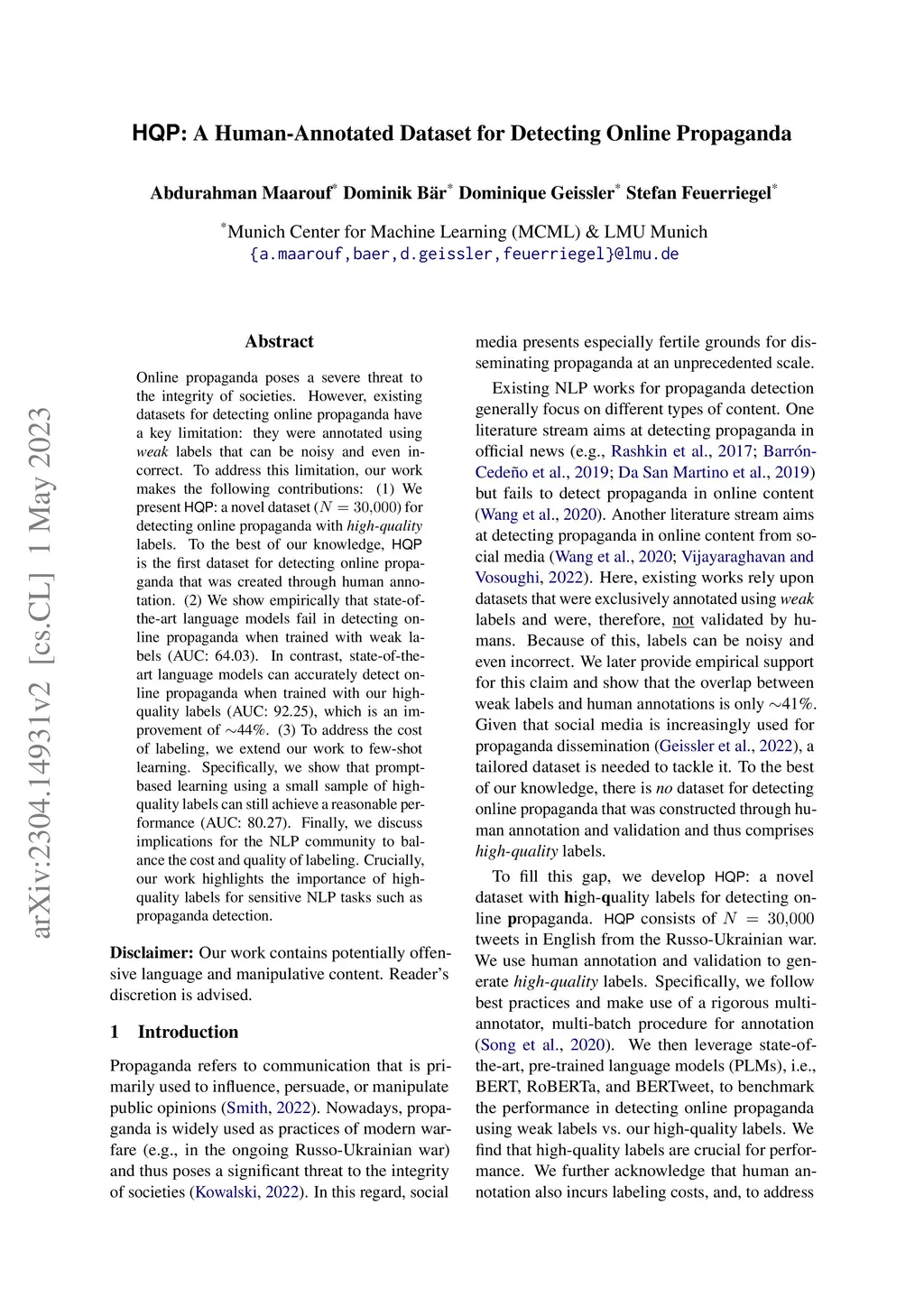 Online propaganda poses a severe threat to the integrity of societies. However, existing datasets for detecting online propaganda have a key limitation: they were annotated using weak labels that can be noisy and even incorrect. To address this limitation, our work makes the following contributions: (1) We present HQP: a novel dataset (N=30,000) for detecting online propaganda with high-quality labels. To the best of our knowledge, HQP is the first dataset for detecting online propaganda that was created through human annotation. (2) We show empirically that state-of-the-art language models fail in detecting online propaganda when trained with weak labels (AUC: 64.03). In contrast, state-of-the-art language models can accurately detect online propaganda when trained with our high-quality labels (AUC: 92.25), which is an improvement of ~44%. (3) To address the cost of labeling, we extend our work to few-shot learning. Specifically, we show that prompt-based learning using a small sample of high-quality labels can still achieve a reasonable performance (AUC: 80.27). Finally, we discuss implications for the NLP community to balance the cost and quality of labeling. Crucially, our work highlights the importance of high-quality labels for sensitive NLP tasks such as propaganda detection.