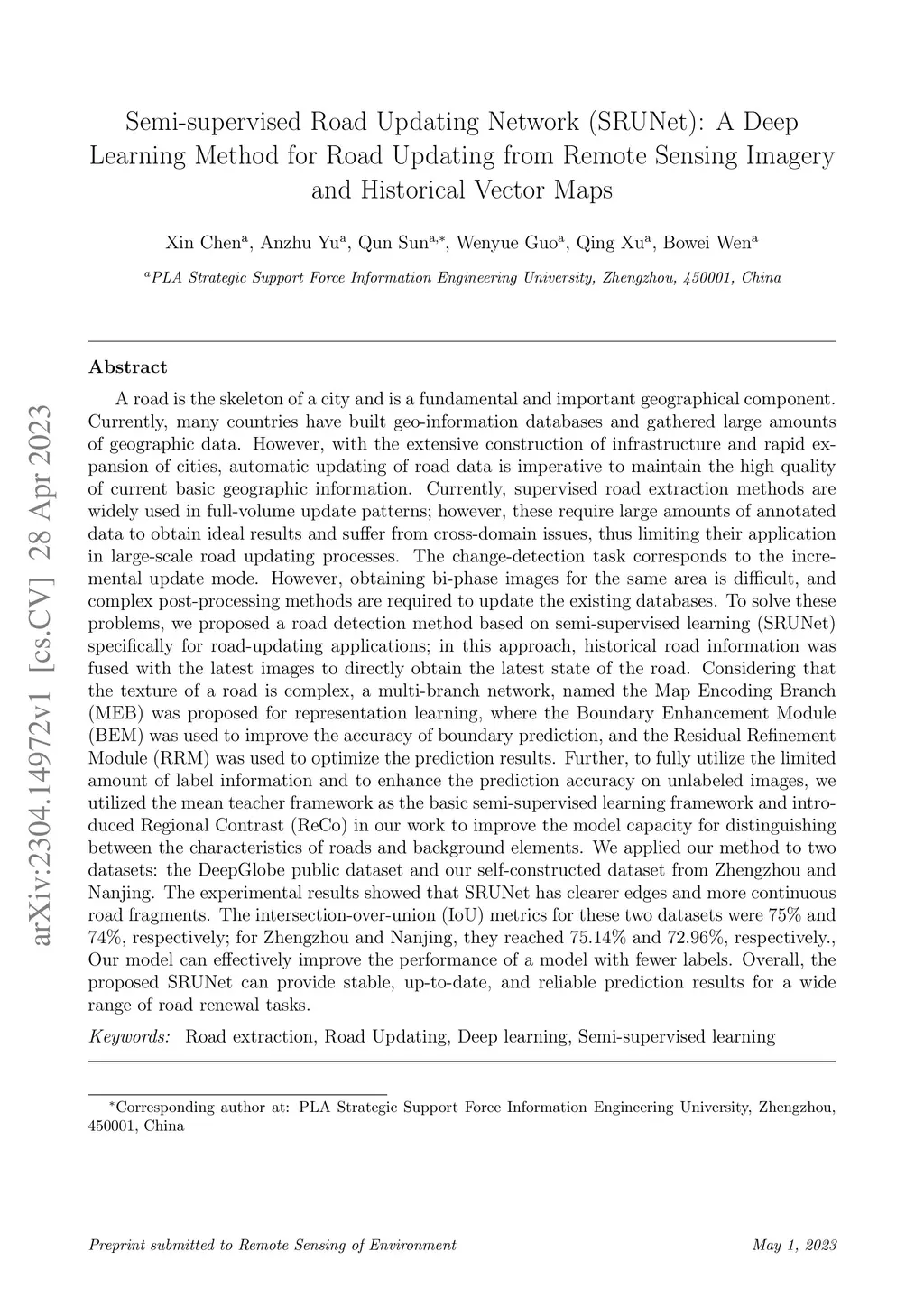 A road is the skeleton of a city and is a fundamental and important geographical component. Currently, many countries have built geo-information databases and gathered large amounts of geographic data. However, with the extensive construction of infrastructure and rapid expansion of cities, automatic updating of road data is imperative to maintain the high quality of current basic geographic information. However, obtaining bi-phase images for the same area is difficult, and complex post-processing methods are required to update the existing databases.To solve these problems, we proposed a road detection method based on semi-supervised learning (SRUNet) specifically for road-updating applications; in this approach, historical road information was fused with the latest images to directly obtain the latest state of the road.Considering that the texture of a road is complex, a multi-branch network, named the Map Encoding Branch (MEB) was proposed for representation learning, where the Boundary Enhancement Module (BEM) was used to improve the accuracy of boundary prediction, and the Residual Refinement Module (RRM) was used to optimize the prediction results. Further, to fully utilize the limited amount of label information and to enhance the prediction accuracy on unlabeled images, we utilized the mean teacher framework as the basic semi-supervised learning framework and introduced Regional Contrast (ReCo) in our work to improve the model capacity for distinguishing between the characteristics of roads and background elements.We applied our method to two datasets. Our model can effectively improve the performance of a model with fewer labels. Overall, the proposed SRUNet can provide stable, up-to-date, and reliable prediction results for a wide range of road renewal tasks.