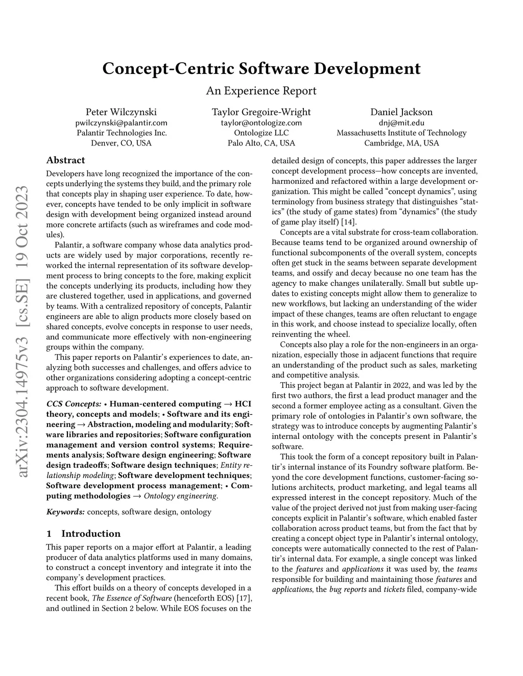 Developers have long recognized the importance of the concepts underlying the systems they build, and the primary role concepts play in shaping user experience. To date, however, concepts have tended to be only implicit in software design with development being organized instead around more concrete artifacts (such as wireframes and code modules). Palantir, a software company whose data analytics products are widely used by major corporations, recently reworked its internal representation of its software development process to bring concepts to the fore, making explicit the concepts underlying its products, how they are clustered, used within and across applications, and governed by teams. With a centralized repository of concepts, Palantir engineers are able to align products more closely based on shared concepts, evolve concepts in response to user needs, and communicate more effectively with non-engineering groups within the company. This paper reports on Palantir's experiences to date, analyzing both successes and challenges, and offers advice to other organizations considering adopting a concept-centric approach to software development