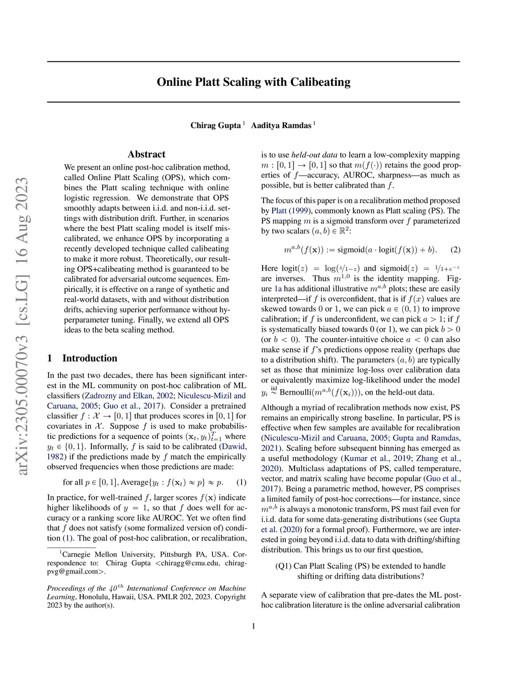 We present an online post-hoc calibration method, called Online Platt Scaling (OPS), which combines the Platt scaling technique with online logistic regression. We demonstrate that OPS smoothly adapts between i.i.d. and non-i.i.d. settings with distribution drift. Further, in scenarios where the best Platt scaling model is itself miscalibrated, we enhance OPS by incorporating a recently developed technique called calibeating to make it more robust. Theoretically, our resulting OPS+calibeating method is guaranteed to be calibrated for adversarial outcome sequences. Empirically, it is effective on a range of synthetic and real-world datasets, with and without distribution drifts, achieving superior performance without hyperparameter tuning. Finally, we extend all OPS ideas to the beta scaling method.