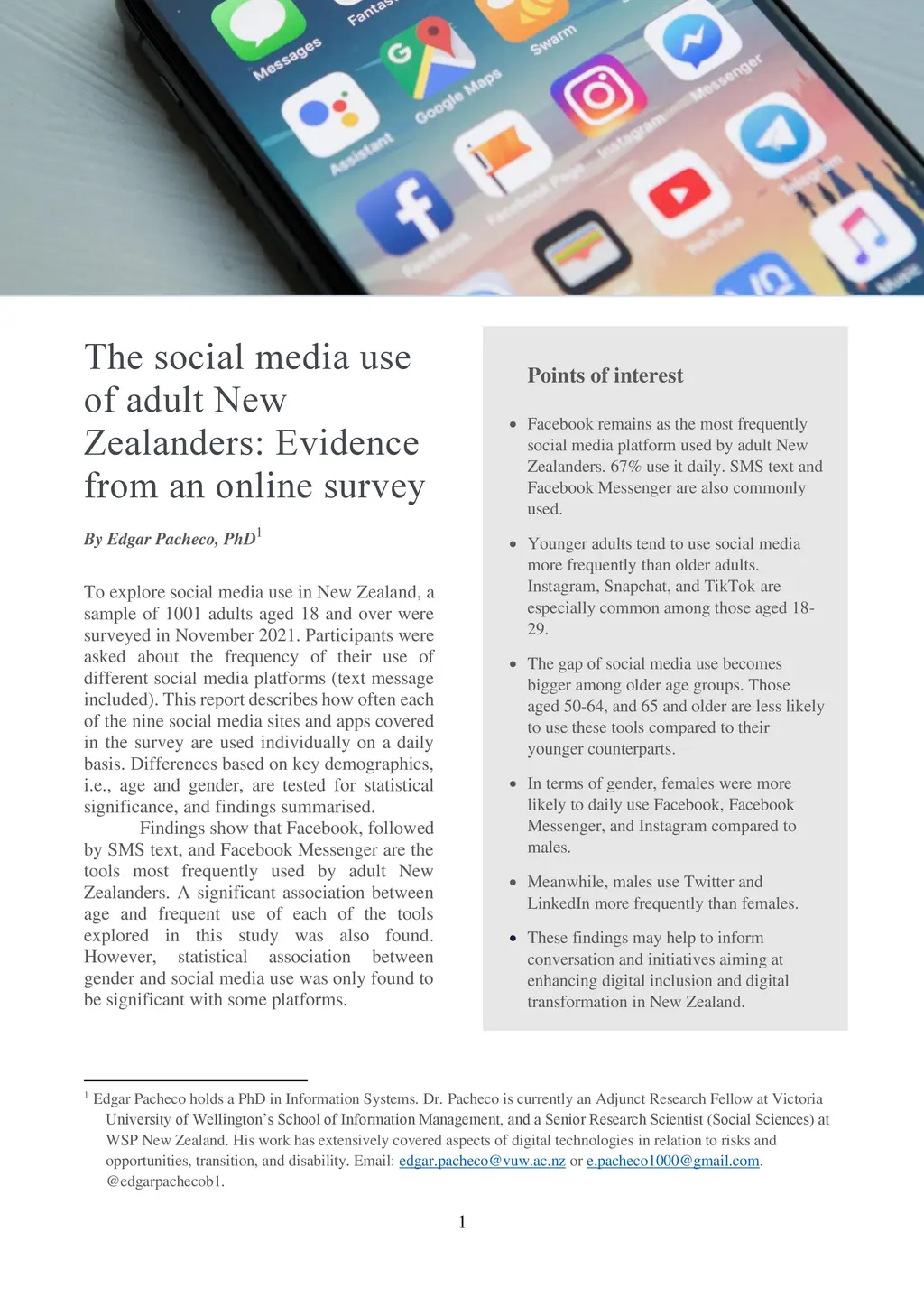 To explore social media use in New Zealand, a sample of 1001 adults aged 18 and over were surveyed in November 2021. Participants were asked about the frequency of their use of different social media platforms (text message included). This report describes how often each of the nine social media sites and apps covered in the survey are used individually on a daily basis. Differences based on key demographics, ie, age and gender, are tested for statistical significance, and findings summarised.