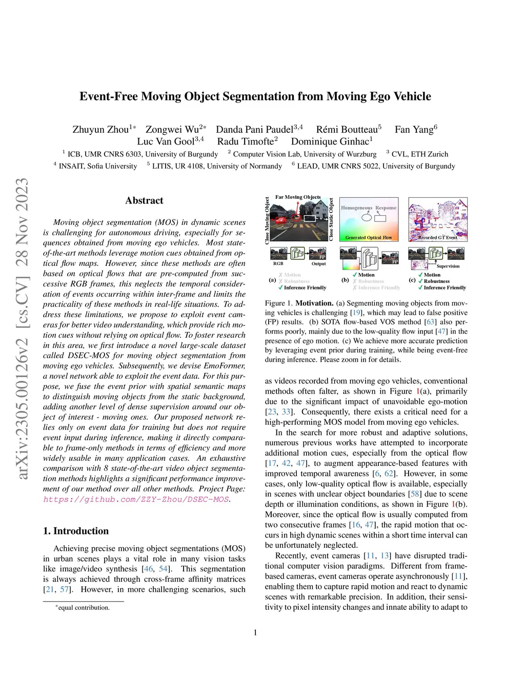 Moving object segmentation (MOS) in dynamic scenes is challenging for autonomous driving, especially for sequences obtained from moving ego vehicles. Most state-of-the-art methods leverage motion cues obtained from optical flow maps. However, since these methods are often based on optical flows that are pre-computed from successive RGB frames, this neglects the temporal consideration of events occurring within inter-frame and limits the practicality of these methods in real-life situations. To address these limitations, we propose to exploit event cameras for better video understanding, which provide rich motion cues without relying on optical flow. To foster research in this area, we first introduce a novel large-scale dataset called DSEC-MOS for moving object segmentation from moving ego vehicles. Subsequently, we devise EmoFormer, a novel network able to exploit the event data. For this purpose, we fuse the event prior with spatial semantic maps to distinguish moving objects from the static background, adding another level of dense supervision around our object of interest - moving ones. Our proposed network relies only on event data for training but does not require event input during inference, making it directly comparable to frame-only methods in terms of efficiency and more widely usable in many application cases. An exhaustive comparison with 8 state-of-the-art video object segmentation methods highlights a significant performance improvement of our method over all other methods. Project Page: https://github.com/ZZY-Zhou/DSEC-MOS.