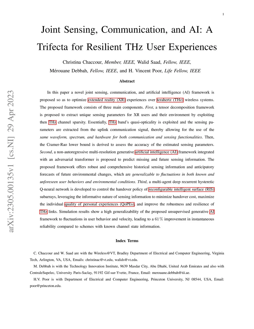 In this paper a novel joint sensing, communication, and artificial intelligence (AI) framework is proposed so as to optimize extended reality (XR) experiences over terahertz (THz) wireless systems. The proposed framework consists of three main components. First, a tensor decomposition framework is proposed to extract unique sensing parameters for XR users and their environment by exploiting then THz channel sparsity. Essentially, THz band's quasi-opticality is exploited and the sensing parameters are extracted from the uplink communication signal, thereby allowing for the use of the same waveform, spectrum, and hardware for both communication and sensing functionalities. Then, the Cramer-Rao lower bound is derived to assess the accuracy of the estimated sensing parameters. Second, a non-autoregressive multi-resolution generative artificial intelligence (AI) framework integrated with an adversarial transformer is proposed to predict missing and future sensing information. The proposed framework offers robust and comprehensive historical sensing information and anticipatory forecasts of future environmental changes, which are generalizable to fluctuations in both known and unforeseen user behaviors and environmental conditions. Third, a multi-agent deep recurrent hysteretic Q-neural network is developed to control the handover policy of reconfigurable intelligent surface (RIS) subarrays, leveraging the informative nature of sensing information to minimize handover cost, maximize the individual quality of personal experiences (QoPEs), and improve the robustness and resilience of THz links. Simulation results show a high generalizability of the proposed unsupervised generative AI framework to fluctuations in user behavior and velocity, leading to a 61 % improvement in instantaneous reliability compared to schemes with known channel state information.