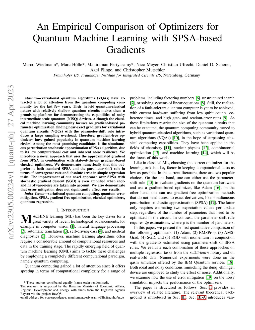 VQA have attracted a lot of attention from the quantum computing community for the last few years. Their hybrid quantum-classical nature with relatively shallow quantum circuits makes them a promising platform for demonstrating the capabilities of NISQ devices. Although the classical machine learning community focuses on gradient-based parameter optimization, finding near-exact gradients for VQC with the parameter-shift rule introduces a large sampling overhead. Therefore, gradient-free optimizers have gained popularity in quantum machine learning circles. Among the most promising candidates is the SPSA algorithm, due to its low computational cost and inherent noise resilience. We introduce a novel approach that uses the approximated gradient from SPSA in combination with state-of-the-art gradient-based classical optimizers. We demonstrate numerically that this outperforms both standard SPSA and the parameter-shift rule in terms of convergence rate and absolute error in simple regression tasks. The improvement of our novel approach over SPSA with stochastic gradient decent is even amplified when shot- and hardware-noise are taken into account. We also demonstrate that error mitigation does not significantly affect our results.