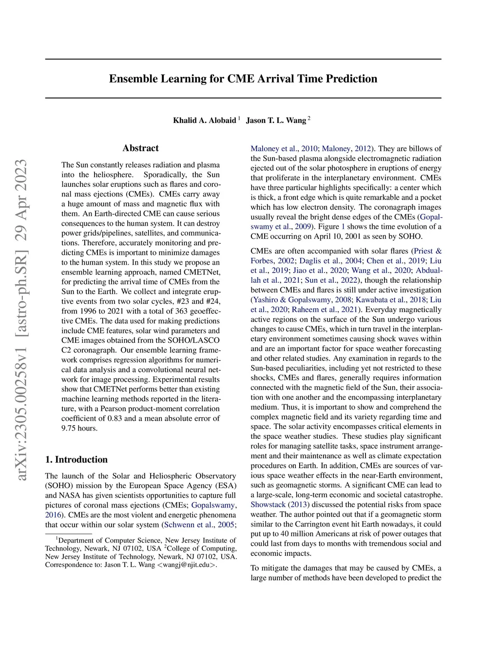 The Sun constantly releases radiation and plasma into the heliosphere. Sporadically, the Sun launches solar eruptions such as flares and coronal mass ejections (CMEs). CMEs carry away a huge amount of mass and magnetic flux with them. An Earth-directed CME can cause serious consequences to the human system. It can destroy power grids/pipelines, satellites, and communications. Therefore, accurately monitoring and predicting CMEs is important to minimize damages to the human system. In this study we propose an ensemble learning approach, named CMETNet, for predicting the arrival time of CMEs from the Sun to the Earth. We collect and integrate eruptive events from two solar cycles, #23 and #24, from 1996 to 2021 with a total of 363 geoeffective CMEs. The data used for making predictions include CME features, solar wind parameters and CME images obtained from the SOHO/LASCO C2 coronagraph. Our ensemble learning framework comprises regression algorithms for numerical data analysis and a convolutional neural network for image processing. Experimental results show that CMETNet performs better than existing machine learning methods reported in the literature, with a Pearson product-moment correlation coefficient of 0.83 and a mean absolute error of 9.75 hours.