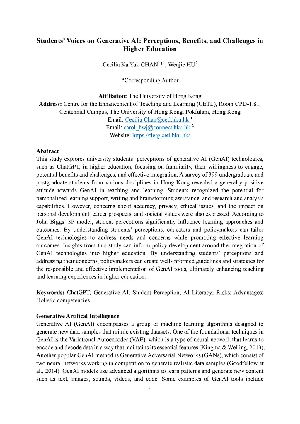 This study explores university students' perceptions of generative AI (GenAI) technologies, such as ChatGPT, in higher education, focusing on familiarity, their willingness to engage, potential benefits and challenges, and effective integration. A survey of 399 undergraduate and postgraduate students from various disciplines in Hong Kong revealed a generally positive attitude towards GenAI in teaching and learning. Students recognized the potential for personalized learning support, writing and brainstorming assistance, and research and analysis capabilities. However, concerns about accuracy, privacy, ethical issues, and the impact on personal development, career prospects, and societal values were also expressed. According to John Biggs' 3P model, student perceptions significantly influence learning approaches and outcomes. By understanding students' perceptions, educators and policymakers can tailor GenAI technologies to address needs and concerns while promoting effective learning outcomes. Insights from this study can inform policy development around the integration of GenAI technologies into higher education. By understanding students' perceptions and addressing their concerns, policymakers can create well-informed guidelines and strategies for the responsible and effective implementation of GenAI tools, ultimately enhancing teaching and learning experiences in higher education.