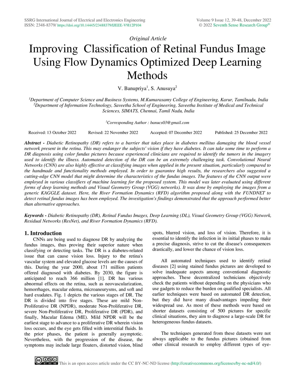 Diabetic Retinopathy (DR) refers to a barrier that takes place in diabetes mellitus damaging the blood vessel network present in the retina. This may endanger the subjects' vision if they have diabetes. It can take some time to perform a DR diagnosis using color fundus pictures because experienced clinicians are required to identify the tumors in the imagery used to identify the illness. Automated detection of the DR can be an extremely challenging task. Convolutional Neural Networks (CNN) are also highly effective at classifying images when applied in the present situation, particularly compared to the handmade and functionality methods employed. In order to guarantee high results, the researchers also suggested a cutting-edge CNN model that might determine the characteristics of the fundus images. The features of the CNN output were employed in various classifiers of machine learning for the proposed system. This model was later evaluated using different forms of deep learning methods and Visual Geometry Group (VGG) networks). It was done by employing the images from a generic KAGGLE dataset. Here, the River Formation Dynamics (RFD) algorithm proposed along with the FUNDNET to detect retinal fundus images has been employed. The investigation's findings demonstrated that the approach performed better than alternative approaches.