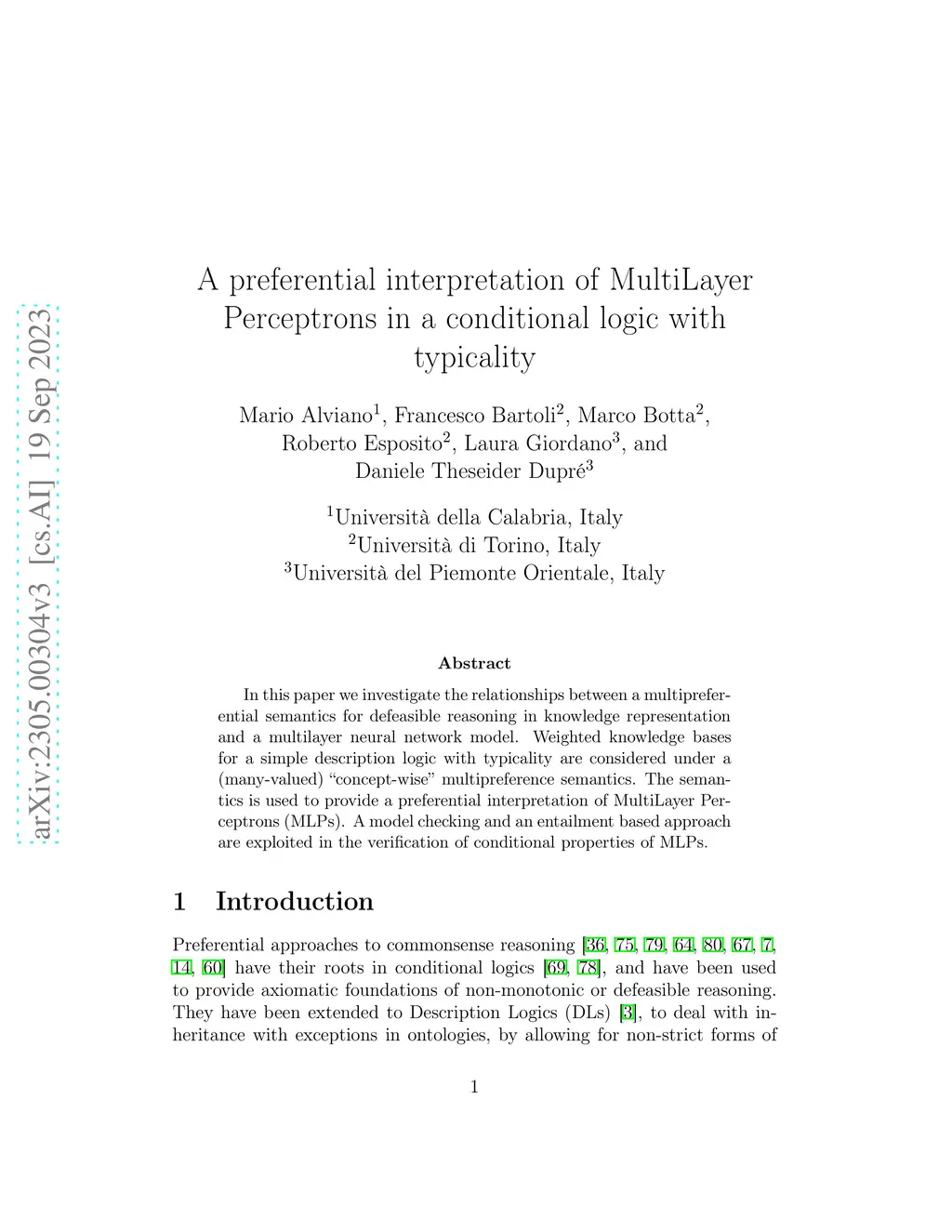 In this paper we investigate the relationships between a multipreferential semantics for defeasible reasoning in knowledge representation and a multilayer neural network model. Weighted knowledge bases for a simple description logic with typicality are considered under a (many-valued) ``concept-wise" multipreference semantics. The semantics is used to provide a preferential interpretation of MultiLayer Perceptrons (MLPs). A model checking and an entailment based approach are exploited in the verification of conditional properties of MLPs.