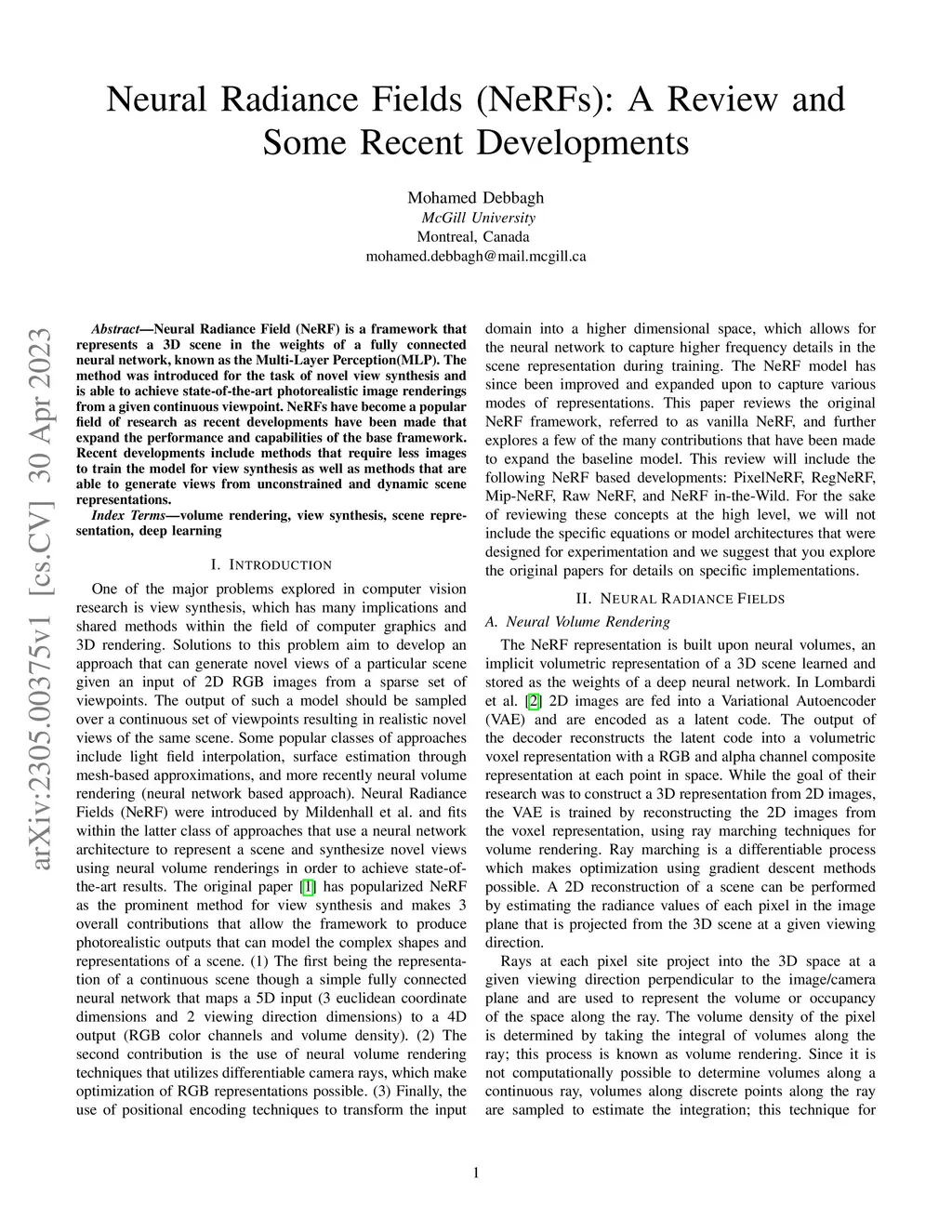 Neural Radiance Fields (NeRFs): A Review and Some Recent Developments