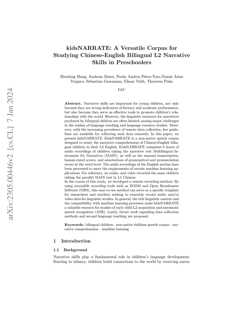 This paper introduces a non-native speech corpus consisting of narratives from fifty 5- to 6-year-old Chinese-English children. Transcripts totaling 6.5 hours of children taking a narrative comprehension test in English (L2) are presented, along with human-rated scores and annotations of grammatical and pronunciation errors. The children also completed the parallel MAIN tests in Chinese (L1) for reference purposes. For all tests we recorded audio and video with our innovative self-developed remote collection methods. The video recordings serve to mitigate the challenge of low intelligibility in L2 narratives produced by young children during the transcription process. This corpus offers valuable resources for second language teaching and has the potential to enhance the overall performance of automatic speech recognition (ASR).