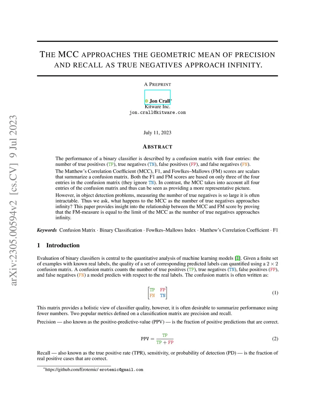 The MCC approaches the geometric mean of precision and recall as true negatives approach infinity