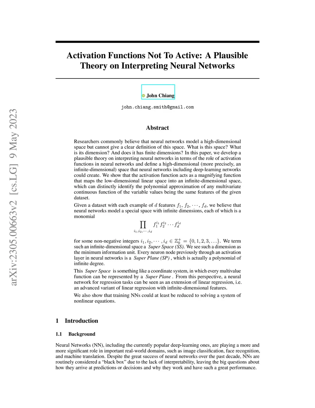 Researchers commonly believe that neural networks model a high-dimensional space but cannot give a clear definition of this space. What is this space? What is its dimension? And does it has finite dimensions? In this paper, we develop a plausible theory on interpreting neural networks in terms of the role of activation functions in neural networks and define a high-dimensional (more precisely, an infinite-dimensional) space that neural networks including deep-learning networks could create. We show that the activation function acts as a magnifying function that maps the low-dimensional linear space into an infinite-dimensional space, which can distinctly identify the polynomial approximation of any multivariate continuous function of the variable values being the same features of the given dataset. Given a dataset with each example of features , , , , we believe that neural networks model a special space with infinite dimensions, each of which is a monomial for some non-negative integers ${i_1, i_2, \cdots, i_d} \in \mathbb{Z}_{0}^{+}=\{0,1,2,3,\ldots\} $. We term such an infinite-dimensional space a . We see such a dimension as the minimum information unit. Every neuron node previously through an activation layer in neural networks is a , which is actually a polynomial of infinite degree. This is something like a coordinate system, in which every multivalue function can be represented by a . We also show that training NNs could at least be reduced to solving a system of nonlinear equations. %solve sets of nonlinear equations