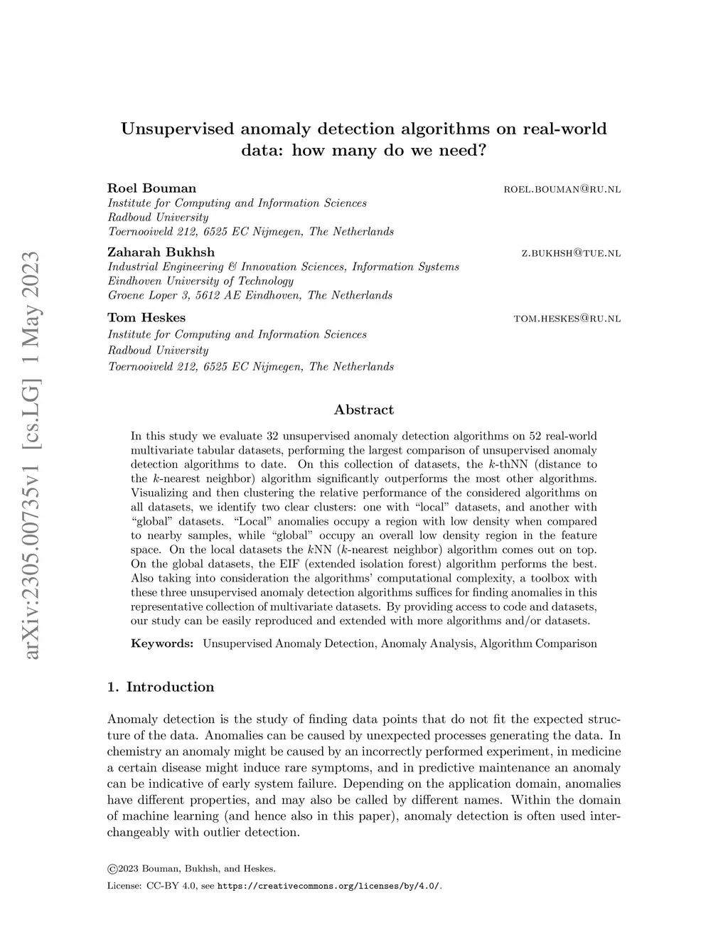 In this study we evaluate 32 unsupervised anomaly detection algorithms on 52 real-world multivariate tabular datasets, performing the largest comparison of unsupervised anomaly detection algorithms to date. On this collection of datasets, the -thNN (distance to the -nearest neighbor) algorithm significantly outperforms the most other algorithms. Visualizing and then clustering the relative performance of the considered algorithms on all datasets, we identify two clear clusters: one with ``local'' datasets, and another with ``global'' datasets. ``Local'' anomalies occupy a region with low density when compared to nearby samples, while ``global'' occupy an overall low density region in the feature space. On the local datasets the NN (-nearest neighbor) algorithm comes out on top. On the global datasets, the EIF (extended isolation forest) algorithm performs the best. Also taking into consideration the algorithms' computational complexity, a toolbox with these three unsupervised anomaly detection algorithms suffices for finding anomalies in this representative collection of multivariate datasets. By providing access to code and datasets, our study can be easily reproduced and extended with more algorithms and/or datasets.