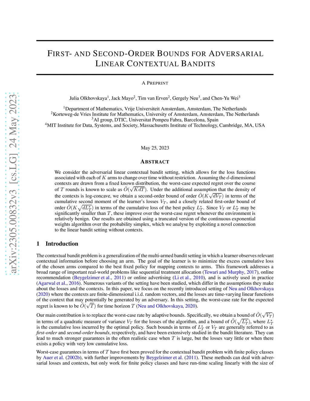 We consider the adversarial linear contextual bandit setting, which allows for the loss functions associated with each of arms to change over time without restriction. Assuming the -dimensional contexts are drawn from a fixed known distribution, the worst-case expected regret over the course of rounds is known to scale as . Under the additional assumption that the density of the contexts is log-concave, we obtain a second-order bound of order in terms of the cumulative second moment of the learner's losses , and a closely related first-order bound of order in terms of the cumulative loss of the best policy . Since or may be significantly smaller than , these improve over the worst-case regret whenever the environment is relatively benign. Our results are obtained using a truncated version of the continuous exponential weights algorithm over the probability simplex, which we analyse by exploiting a novel connection to the linear bandit setting without contexts.