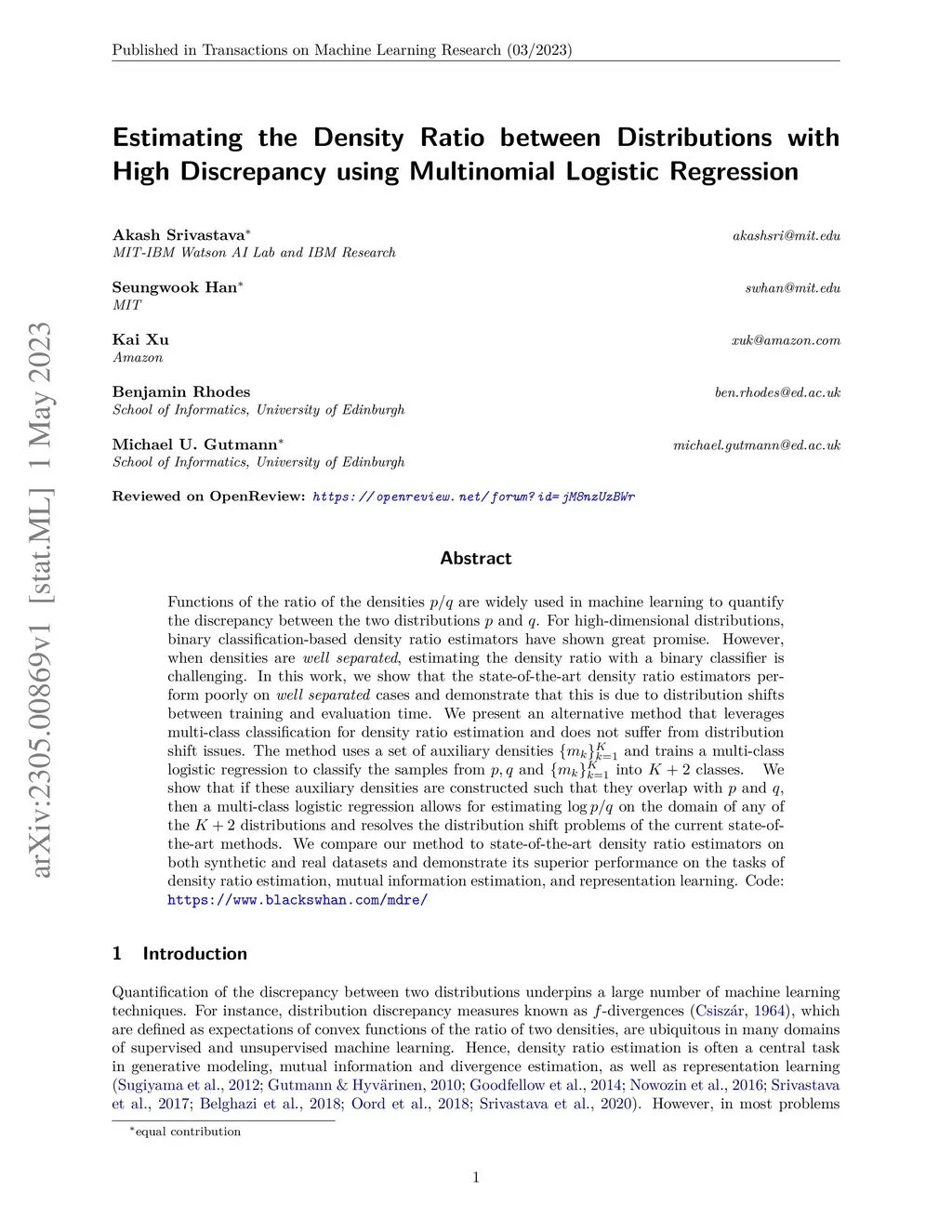 Functions of the ratio of the densities are widely used in machine learning to quantify the discrepancy between the two distributions and . For high-dimensional distributions, binary classification-based density ratio estimators have shown great promise. However, when densities are well separated, estimating the density ratio with a binary classifier is challenging. In this work, we show that the state-of-the-art density ratio estimators perform poorly on well-separated cases and demonstrate that this is due to distribution shifts between training and evaluation time. We present an alternative method that leverages multi-class classification for density ratio estimation and does not suffer from distribution shift issues. The method uses a set of auxiliary densities and trains a multi-class logistic regression to classify the samples from , and into classes. We show that if these auxiliary densities are constructed such that they overlap with and , then a multi-class logistic regression allows for estimating on the domain of any of the distributions and resolves the distribution shift problems of the current state-of-the-art methods. We compare our method to state-of-the-art density ratio estimators on both synthetic and real datasets and demonstrate its superior performance on the tasks of density ratio estimation, mutual information estimation, and representation learning. Code: https://www.blackswhan.com/mdre/
