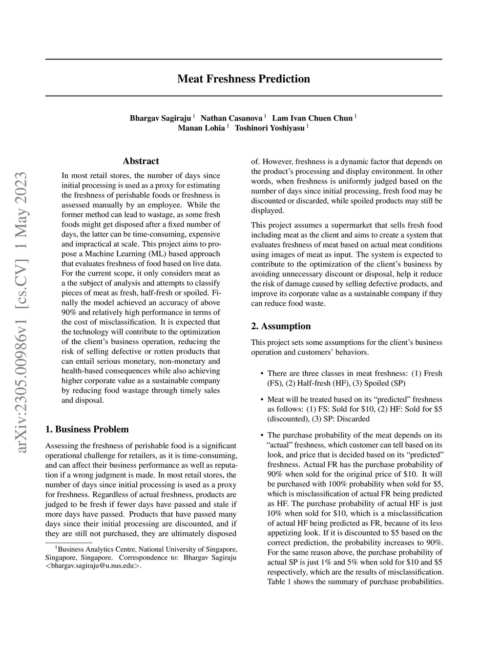 In most retail stores, the number of days since initial processing is used as a proxy for estimating the freshness of perishable foods or freshness is assessed manually by an employee. While the former method can lead to wastage, as some fresh foods might get disposed after a fixed number of days, the latter can be time-consuming, expensive and impractical at scale. This project aims to propose a Machine Learning (ML) based approach that evaluates freshness of food based on live data. For the current scope, it only considers meat as a the subject of analysis and attempts to classify pieces of meat as fresh, half-fresh or spoiled. Finally the model achieved an accuracy of above 90% and relatively high performance in terms of the cost of misclassification. It is expected that the technology will contribute to the optimization of the client's business operation, reducing the risk of selling defective or rotten products that can entail serious monetary, non-monetary and health-based consequences while also achieving higher corporate value as a sustainable company by reducing food wastage through timely sales and disposal.