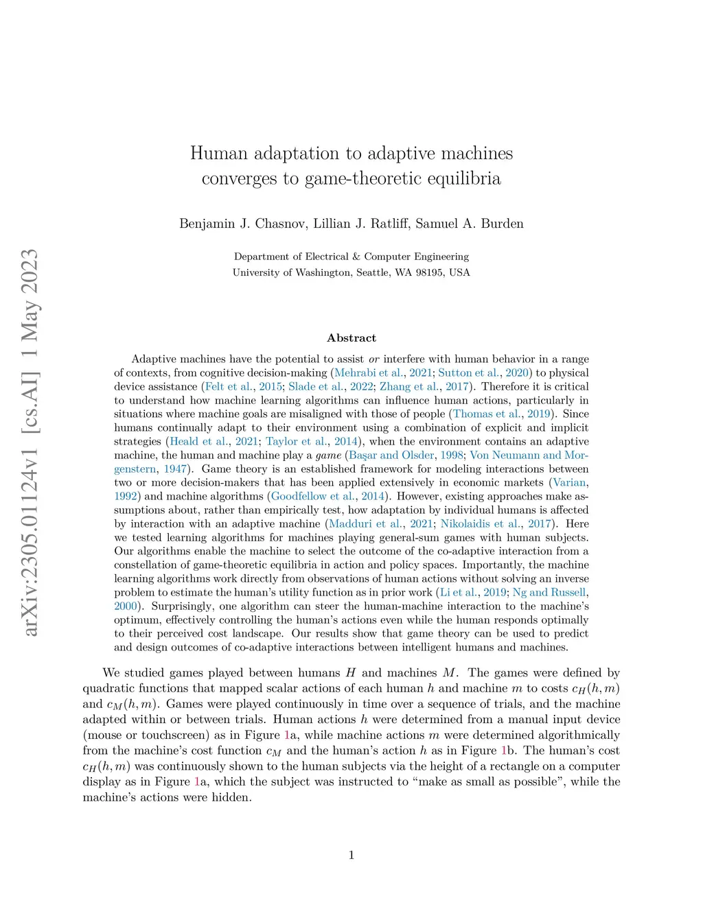 Adaptive machines have the potential to assist or interfere with human behavior in a range of contexts, from cognitive decision-making to physical device assistance. Therefore it is critical to understand how machine learning algorithms can influence human actions, particularly in situations where machine goals are misaligned with those of people. Since humans continually adapt to their environment using a combination of explicit and implicit strategies, when the environment contains an adaptive machine, the human and machine play a game. Game theory is an established framework for modeling interactions between two or more decision-makers that has been applied extensively in economic markets and machine algorithms. However, existing approaches make assumptions about, rather than empirically test, how adaptation by individual humans is affected by interaction with an adaptive machine. Here we tested learning algorithms for machines playing general-sum games with human subjects. Our algorithms enable the machine to select the outcome of the co-adaptive interaction from a constellation of game-theoretic equilibria in action and policy spaces. Importantly, the machine learning algorithms work directly from observations of human actions without solving an inverse problem to estimate the human's utility function as in prior work. Surprisingly, one algorithm can steer the human-machine interaction to the machine's optimum, effectively controlling the human's actions even while the human responds optimally to their perceived cost landscape. Our results show that game theory can be used to predict and design outcomes of co-adaptive interactions between intelligent humans and machines.