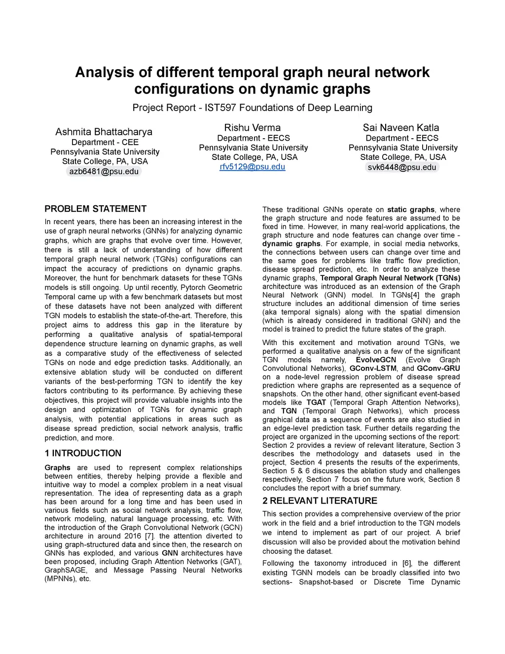 In recent years, there has been an increasing interest in the use of graph neural networks (GNNs) for analyzing dynamic graphs, which are graphs that evolve over time. However, there is still a lack of understanding of how different temporal graph neural network (TGNs) configurations can impact the accuracy of predictions on dynamic graphs. Moreover, the hunt for benchmark datasets for these TGNs models is still ongoing. Up until recently, Pytorch Geometric Temporal came up with a few benchmark datasets but most of these datasets have not been analyzed with different TGN models to establish the state-of-the-art. Therefore, this project aims to address this gap in the literature by performing a qualitative analysis of spatial-temporal dependence structure learning on dynamic graphs, as well as a comparative study of the effectiveness of selected TGNs on node and edge prediction tasks. Additionally, an extensive ablation study will be conducted on different variants of the best-performing TGN to identify the key factors contributing to its performance. By achieving these objectives, this project will provide valuable insights into the design and optimization of TGNs for dynamic graph analysis, with potential applications in areas such as disease spread prediction, social network analysis, traffic prediction, and more. Moreover, an attempt is made to convert snapshot-based data to the event-based dataset and make it compatible with the SOTA model namely TGN to perform node regression task.