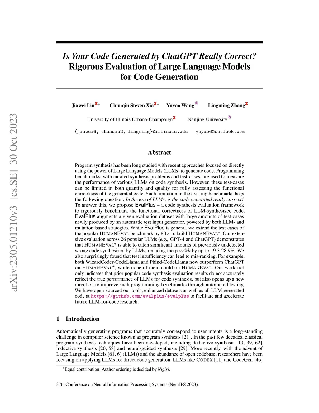 Program synthesis has been long studied with recent approaches focused on directly using the power of Large Language Models (LLMs) to generate code. Programming benchmarks, with curated synthesis problems and test-cases, are used to measure the performance of various LLMs on code synthesis. However, these test-cases can be limited in both quantity and quality for fully assessing the functional correctness of the generated code. Such limitation in the existing benchmarks begs the following question: In the era of LLMs, is the code generated really correct? To answer this, we propose EvalPlus -- a code synthesis evaluation framework to rigorously benchmark the functional correctness of LLM-synthesized code. EvalPlus augments a given evaluation dataset with large amounts of test-cases newly produced by an automatic test input generator, powered by both LLM- and mutation-based strategies. While EvalPlus is general, we extend the test-cases of the popular HumanEval benchmark by 80x to build HumanEval+. Our extensive evaluation across 26 popular LLMs (e.g., GPT-4 and ChatGPT) demonstrates that HumanEval+ is able to catch significant amounts of previously undetected wrong code synthesized by LLMs, reducing the pass@k by up-to 19.3-28.9%. We also surprisingly found that test insufficiency can lead to mis-ranking. For example, both WizardCoder-CodeLlama and Phind-CodeLlama now outperform ChatGPT on HumanEval+, while none of them could on HumanEval. Our work not only indicates that prior popular code synthesis evaluation results do not accurately reflect the true performance of LLMs for code synthesis, but also opens up a new direction to improve such programming benchmarks through automated testing. We have open-sourced our tools, enhanced datasets as well as all LLM-generated code at https://github.com/evalplus/evalplus to facilitate and accelerate future LLM-for-code research.