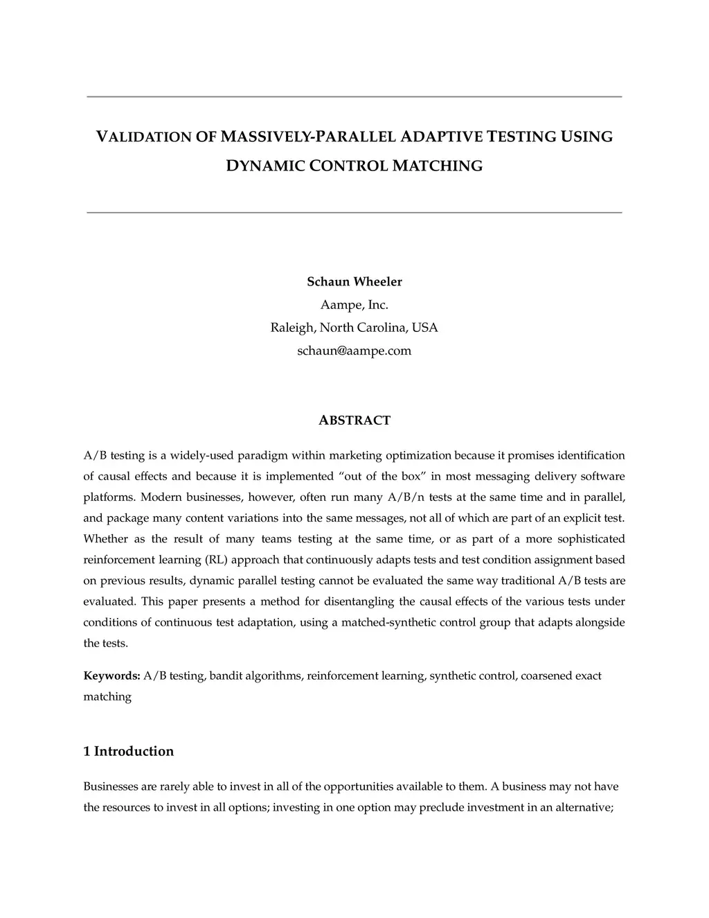 A/B testing is a widely-used paradigm within marketing optimization because it promises identification of causal effects and because it is implemented out of the box in most messaging delivery software platforms. Modern businesses, however, often run many A/B/n tests at the same time and in parallel, and package many content variations into the same messages, not all of which are part of an explicit test. Whether as the result of many teams testing at the same time, or as part of a more sophisticated reinforcement learning (RL) approach that continuously adapts tests and test condition assignment based on previous results, dynamic parallel testing cannot be evaluated the same way traditional A/B tests are evaluated. This paper presents a method for disentangling the causal effects of the various tests under conditions of continuous test adaptation, using a matched-synthetic control group that adapts alongside the tests.