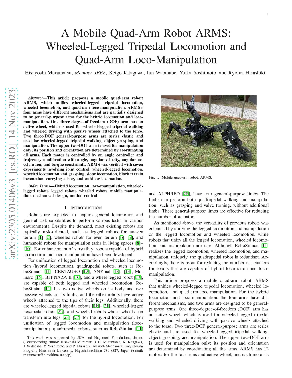 A Mobile Quad-Arm Robot ARMS: Wheeled-Legged Tripedal Locomotion and