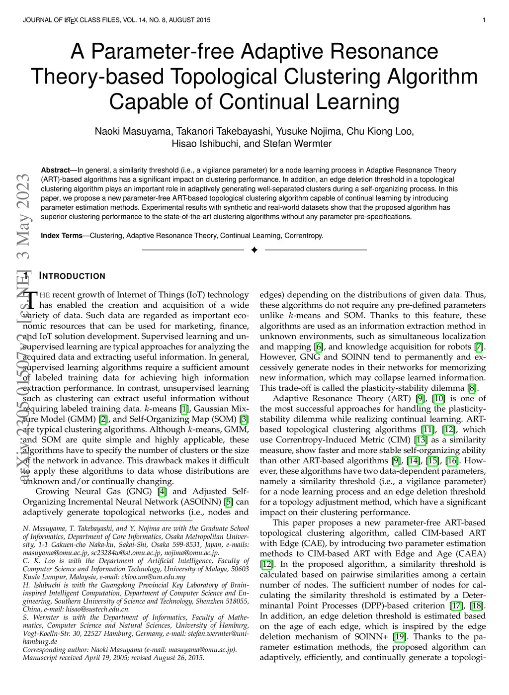A Parameter-free Adaptive Resonance Theory-based Topological Clustering Algorithm Capable of Continual Learning