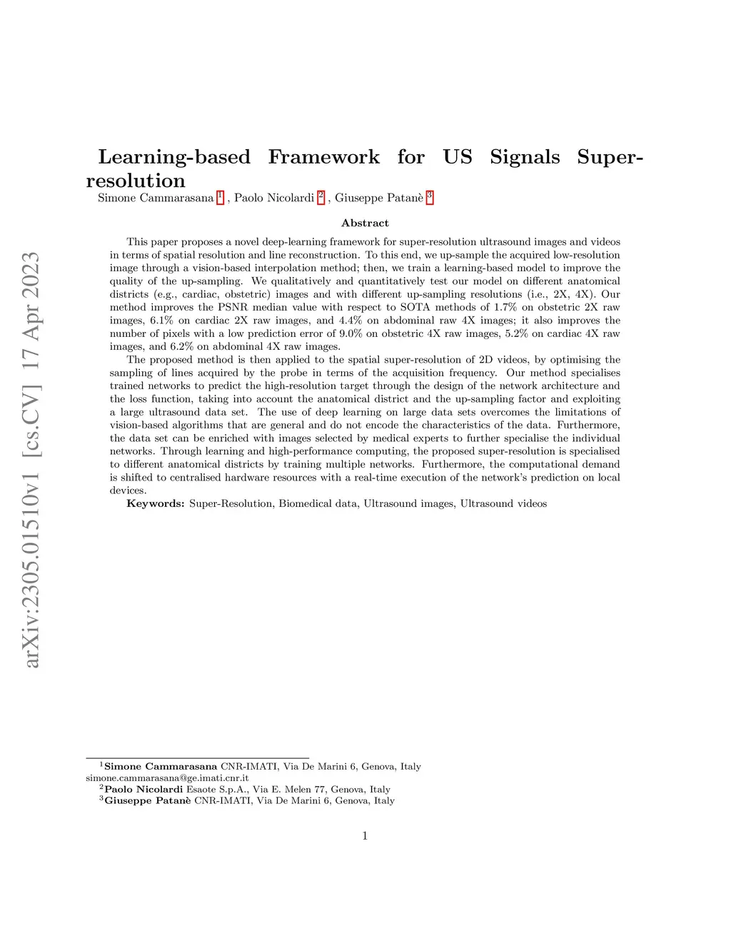 We propose a novel deep-learning framework for super-resolution ultrasound images and videos in terms of spatial resolution and line reconstruction. We up-sample the acquired low-resolution image through a vision-based interpolation method; then, we train a learning-based model to improve the quality of the up-sampling. We qualitatively and quantitatively test our model on different anatomical districts (e.g., cardiac, obstetric) images and with different up-sampling resolutions (i.e., 2X, 4X). Our method improves the PSNR median value with respect to SOTA methods of on obstetric 2X raw images, on cardiac 2X raw images, and on abdominal raw 4X images; it also improves the number of pixels with a low prediction error of on obstetric 4X raw images, on cardiac 4X raw images, and on abdominal 4X raw images. The proposed method is then applied to the spatial super-resolution of 2D videos, by optimising the sampling of lines acquired by the probe in terms of the acquisition frequency. Our method specialises trained networks to predict the high-resolution target through the design of the network architecture and the loss function, taking into account the anatomical district and the up-sampling factor and exploiting a large ultrasound data set. The use of deep learning on large data sets overcomes the limitations of vision-based algorithms that are general and do not encode the characteristics of the data. Furthermore, the data set can be enriched with images selected by medical experts to further specialise the individual networks. Through learning and high-performance computing, our super-resolution is specialised to different anatomical districts by training multiple networks. Furthermore, the computational demand is shifted to centralised hardware resources with a real-time execution of the network's prediction on local devices.