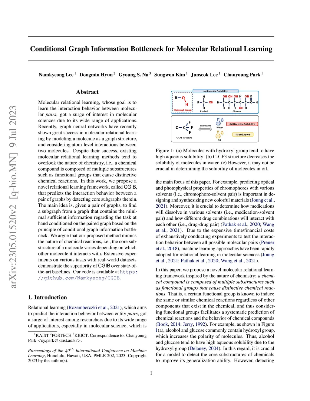Molecular relational learning, whose goal is to learn the interaction behavior between molecular pairs, got a surge of interest in molecular sciences due to its wide range of applications. Recently, graph neural networks have recently shown great success in molecular relational learning by modeling a molecule as a graph structure, and considering atom-level interactions between two molecules. Despite their success, existing molecular relational learning methods tend to overlook the nature of chemistry, i.e., a chemical compound is composed of multiple substructures such as functional groups that cause distinctive chemical reactions. In this work, we propose a novel relational learning framework, called CGIB, that predicts the interaction behavior between a pair of graphs by detecting core subgraphs therein. The main idea is, given a pair of graphs, to find a subgraph from a graph that contains the minimal sufficient information regarding the task at hand conditioned on the paired graph based on the principle of conditional graph information bottleneck. We argue that our proposed method mimics the nature of chemical reactions, i.e., the core substructure of a molecule varies depending on which other molecule it interacts with. Extensive experiments on various tasks with real-world datasets demonstrate the superiority of CGIB over state-of-the-art baselines. Our code is available at https://github.com/Namkyeong/CGIB.