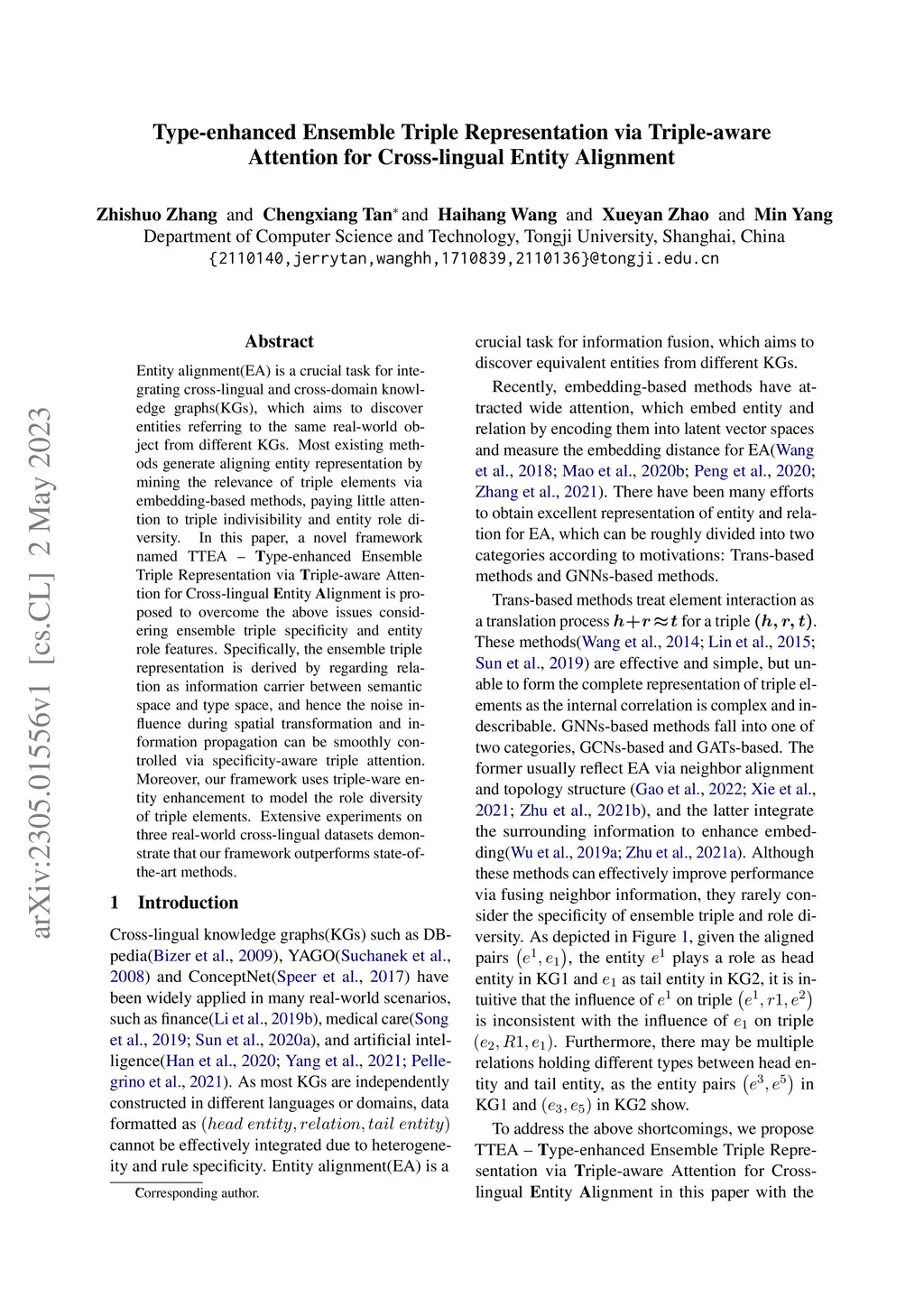 Entity alignment(EA) is a crucial task for integrating cross-lingual and cross-domain knowledge graphs(KGs), which aims to discover entities referring to the same real-world object from different KGs. Most existing methods generate aligning entity representation by mining the relevance of triple elements via embedding-based methods, paying little attention to triple indivisibility and entity role diversity. In this paper, a novel framework named TTEA -- Type-enhanced Ensemble Triple Representation via Triple-aware Attention for Cross-lingual Entity Alignment is proposed to overcome the above issues considering ensemble triple specificity and entity role features. Specifically, the ensemble triple representation is derived by regarding relation as information carrier between semantic space and type space, and hence the noise influence during spatial transformation and information propagation can be smoothly controlled via specificity-aware triple attention. Moreover, our framework uses triple-ware entity enhancement to model the role diversity of triple elements. Extensive experiments on three real-world cross-lingual datasets demonstrate that our framework outperforms state-of-the-art methods.