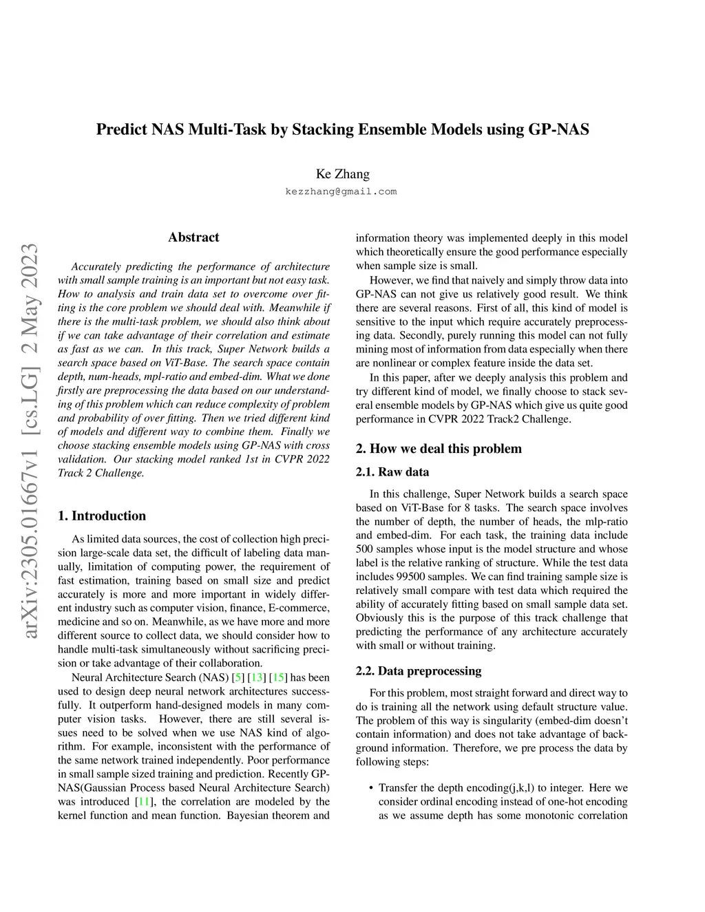 Accurately predicting the performance of architecture with small sample training is an important but not easy task. How to analysis and train dataset to overcome overfitting is the core problem we should deal with. Meanwhile if there is the mult-task problem, we should also think about if we can take advantage of their correlation and estimate as fast as we can. In this track, Super Network builds a search space based on ViT-Base. The search space contain depth, num-heads, mpl-ratio and embed-dim. What we done firstly are pre-processing the data based on our understanding of this problem which can reduce complexity of problem and probability of over fitting. Then we tried different kind of models and different way to combine them. Finally we choose stacking ensemble models using GP-NAS with cross validation. Our stacking model ranked 1st in CVPR 2022 Track 2 Challenge.
