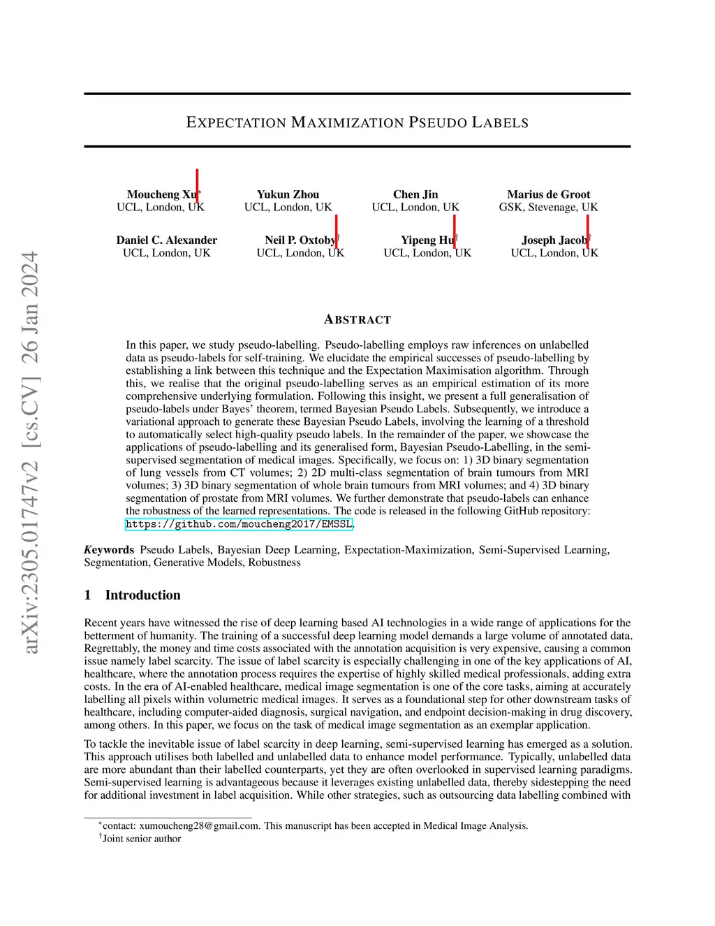In this paper, we study pseudo-labelling. Pseudo-labelling employs raw inferences on unlabelled data as pseudo-labels for self-training. We elucidate the empirical successes of pseudo-labelling by establishing a link between this technique and the Expectation Maximisation algorithm. Through this, we realise that the original pseudo-labelling serves as an empirical estimation of its more comprehensive underlying formulation. Following this insight, we present a full generalisation of pseudo-labels under Bayes' theorem, termed Bayesian Pseudo Labels. Subsequently, we introduce a variational approach to generate these Bayesian Pseudo Labels, involving the learning of a threshold to automatically select high-quality pseudo labels. In the remainder of the paper, we showcase the applications of pseudo-labelling and its generalised form, Bayesian Pseudo-Labelling, in the semi-supervised segmentation of medical images. Specifically, we focus on: 1) 3D binary segmentation of lung vessels from CT volumes; 2) 2D multi-class segmentation of brain tumours from MRI volumes; 3) 3D binary segmentation of whole brain tumours from MRI volumes; and 4) 3D binary segmentation of prostate from MRI volumes. We further demonstrate that pseudo-labels can enhance the robustness of the learned representations. The code is released in the following GitHub repository: https://github.com/moucheng2017/EMSSL