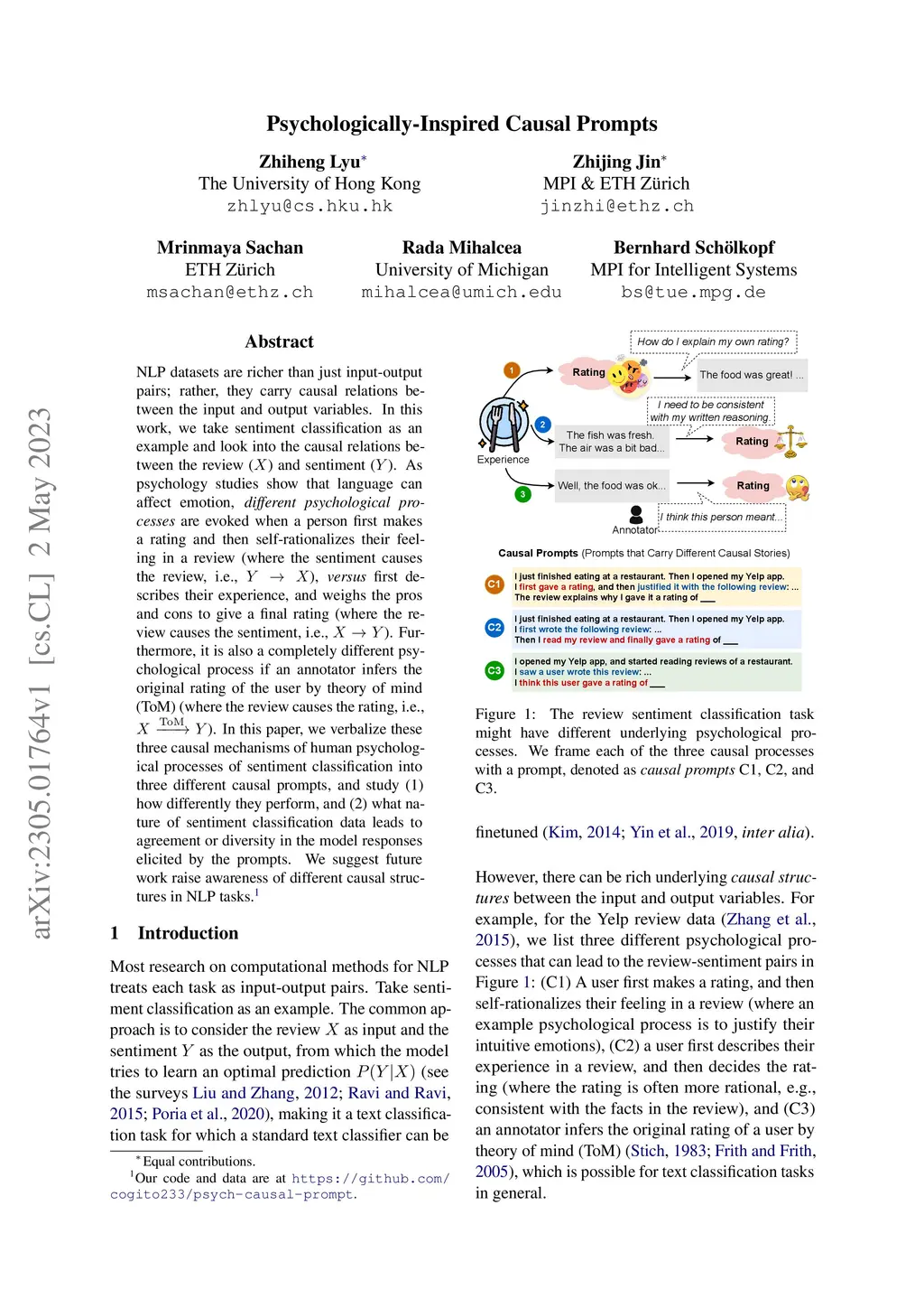 NLP datasets are richer than just input-output pairs; rather, they carry causal relations between the input and output variables. In this work, we take sentiment classification as an example and look into the causal relations between the review (X) and sentiment (Y). As psychology studies show that language can affect emotion, different psychological processes are evoked when a person first makes a rating and then self-rationalizes their feeling in a review (where the sentiment causes the review, i.e., Y -> X), versus first describes their experience, and weighs the pros and cons to give a final rating (where the review causes the sentiment, i.e., X -> Y ). Furthermore, it is also a completely different psychological process if an annotator infers the original rating of the user by theory of mind (ToM) (where the review causes the rating, i.e., X -ToM-> Y ). In this paper, we verbalize these three causal mechanisms of human psychological processes of sentiment classification into three different causal prompts, and study (1) how differently they perform, and (2) what nature of sentiment classification data leads to agreement or diversity in the model responses elicited by the prompts. We suggest future work raise awareness of different causal structures in NLP tasks. Our code and data are at https://github.com/cogito233/psych-causal-prompt
